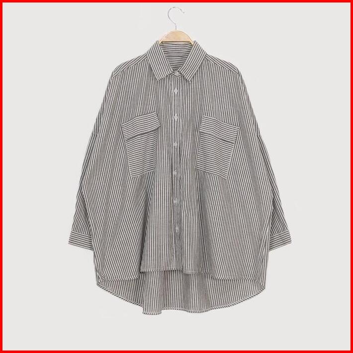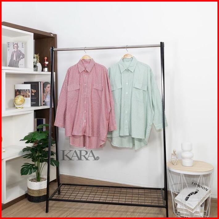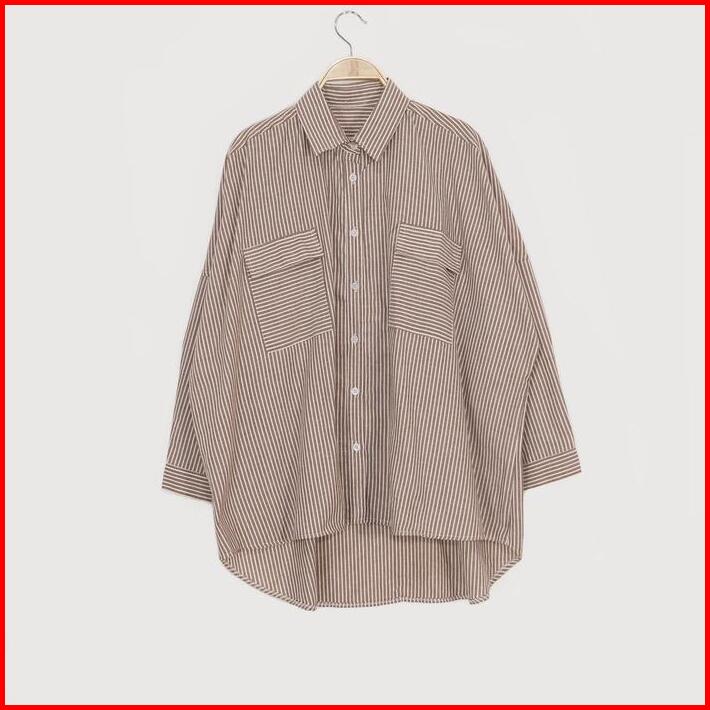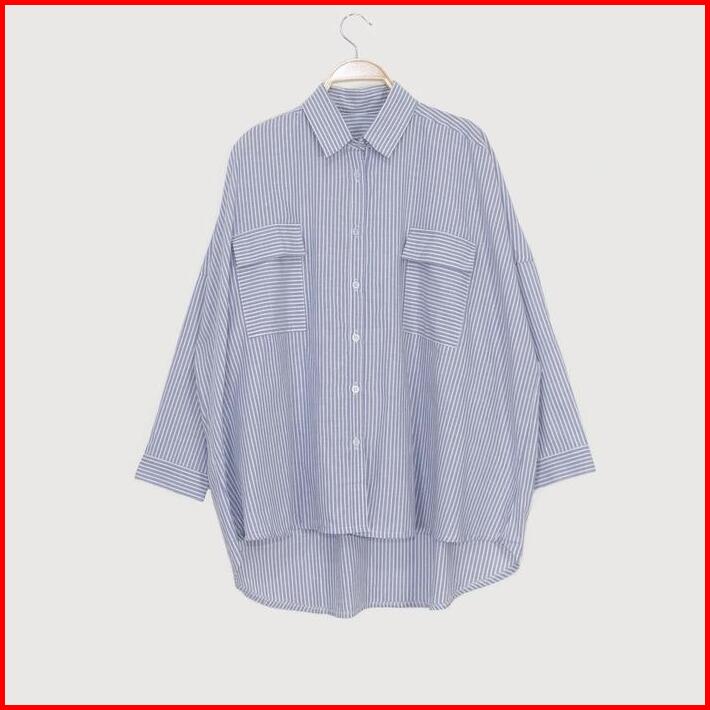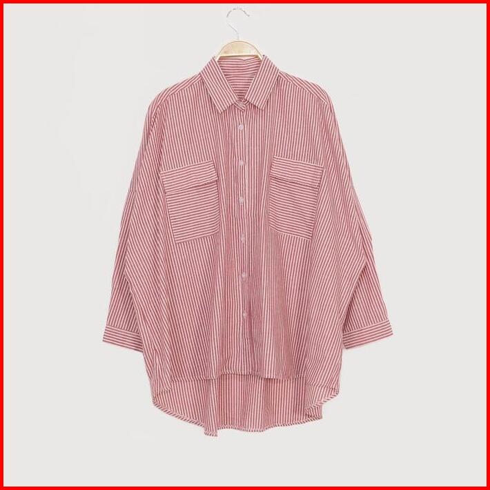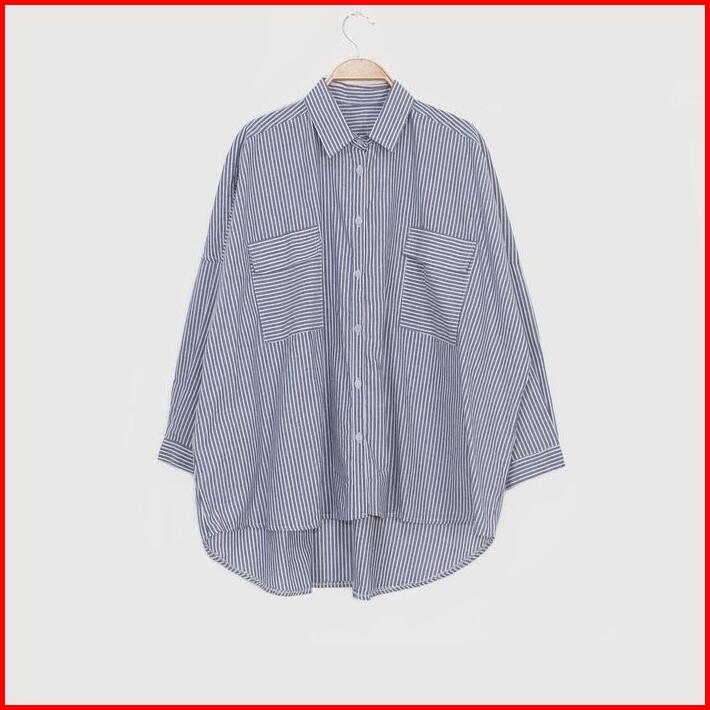 Kara.id Pocket Salur Kemeja Oversized Pakaian Wanita Stripe Shirt Atasan Wanita Lengan Panjang Fit Katun