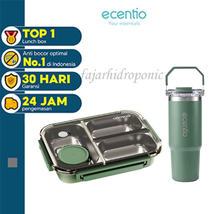 ecentio lunch box stainless 800ml sekat 3 dengan sendok sumpit free kotak sauce kecil dan ecentio tumbler 900ml