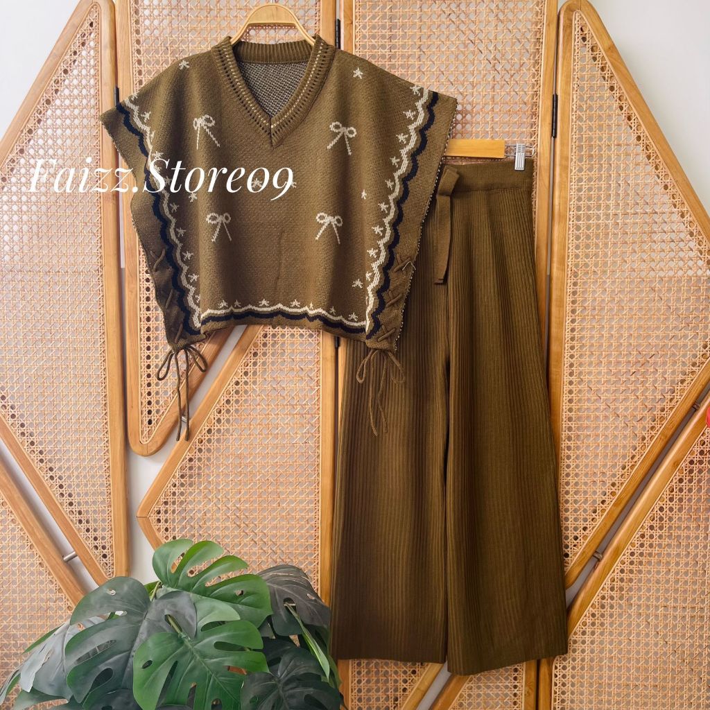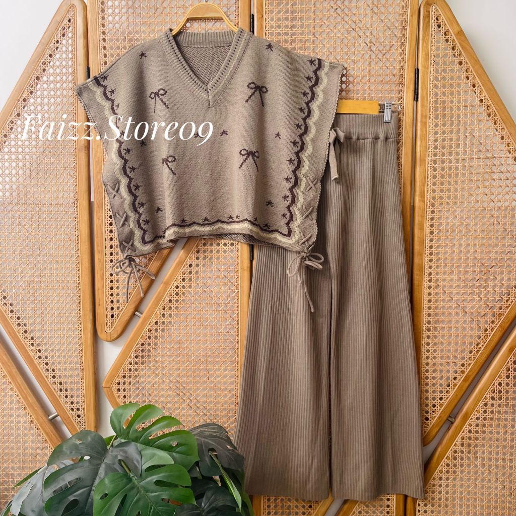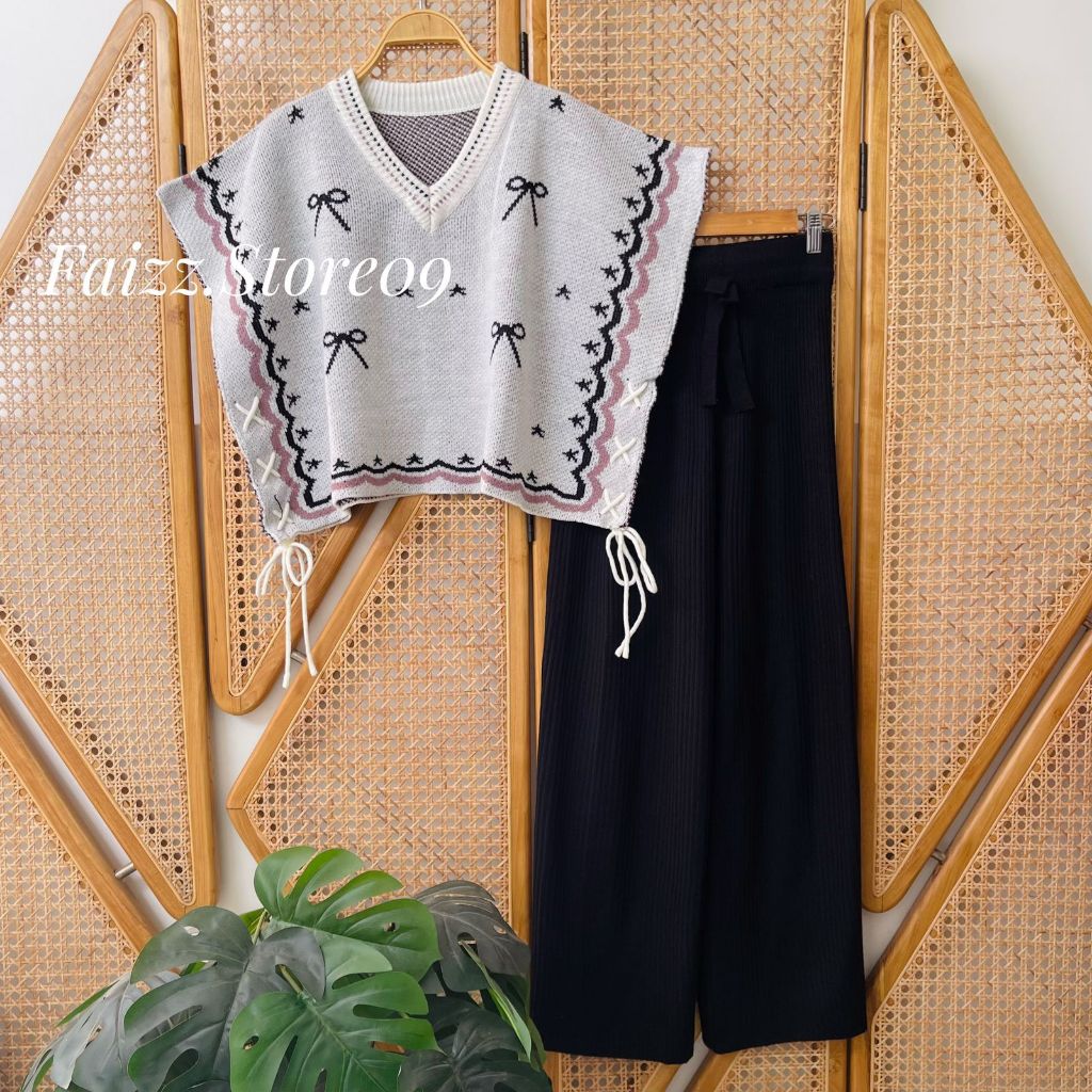 Oneset Ayundi Vest Rajut Wanita Kerah V Motif Pita Talikur Setelan Celana Kulot Premium Wanita Kekinian