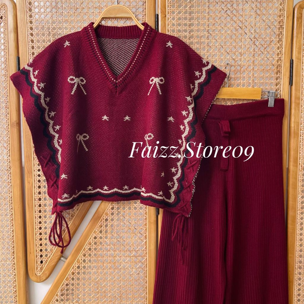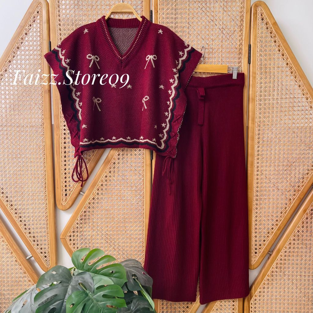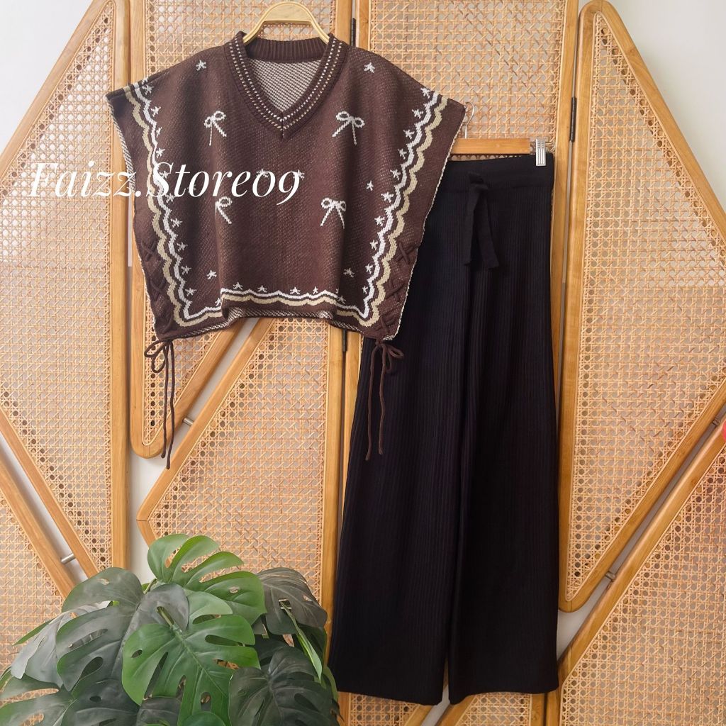 Oneset Ayundi Vest Rajut Wanita Kerah V Motif Pita Talikur Setelan Celana Kulot Premium Wanita Kekinian
