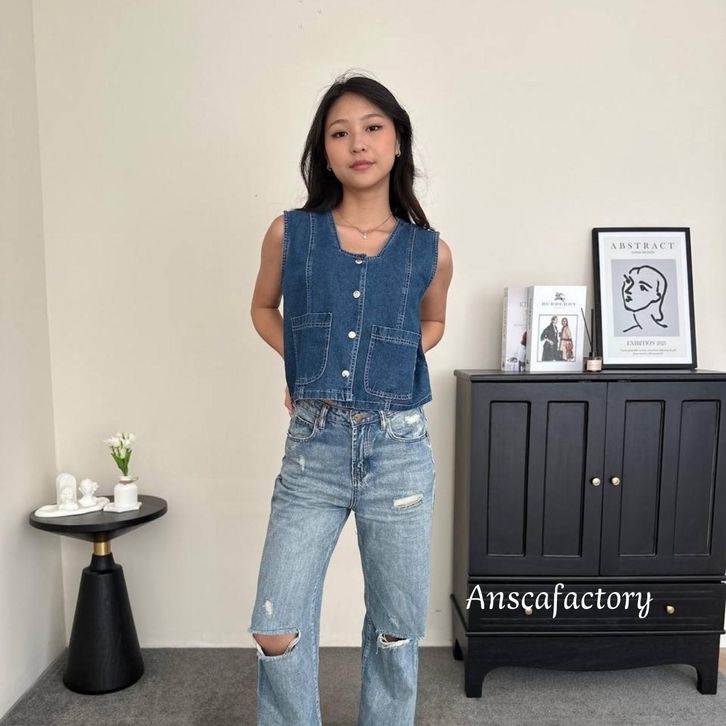 @nscafactory - Cyra Vest 710 - Atasan Wanita Outer Crop Denim - Rompi U-Neck Sleeveless Pocket