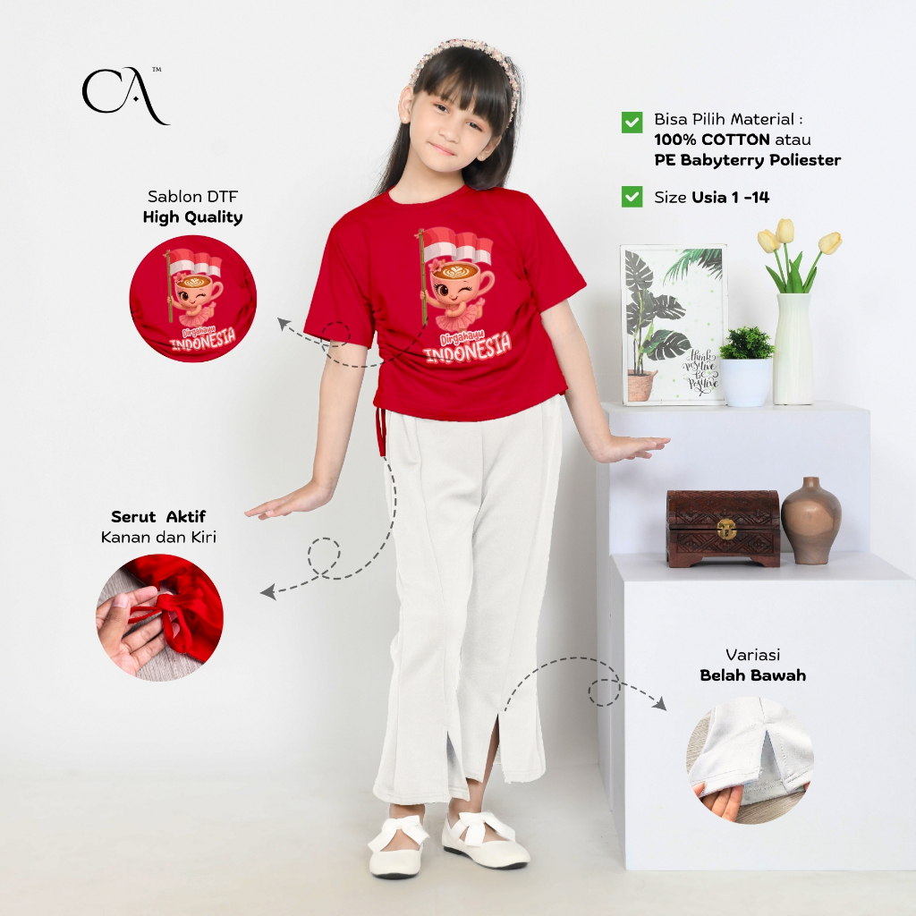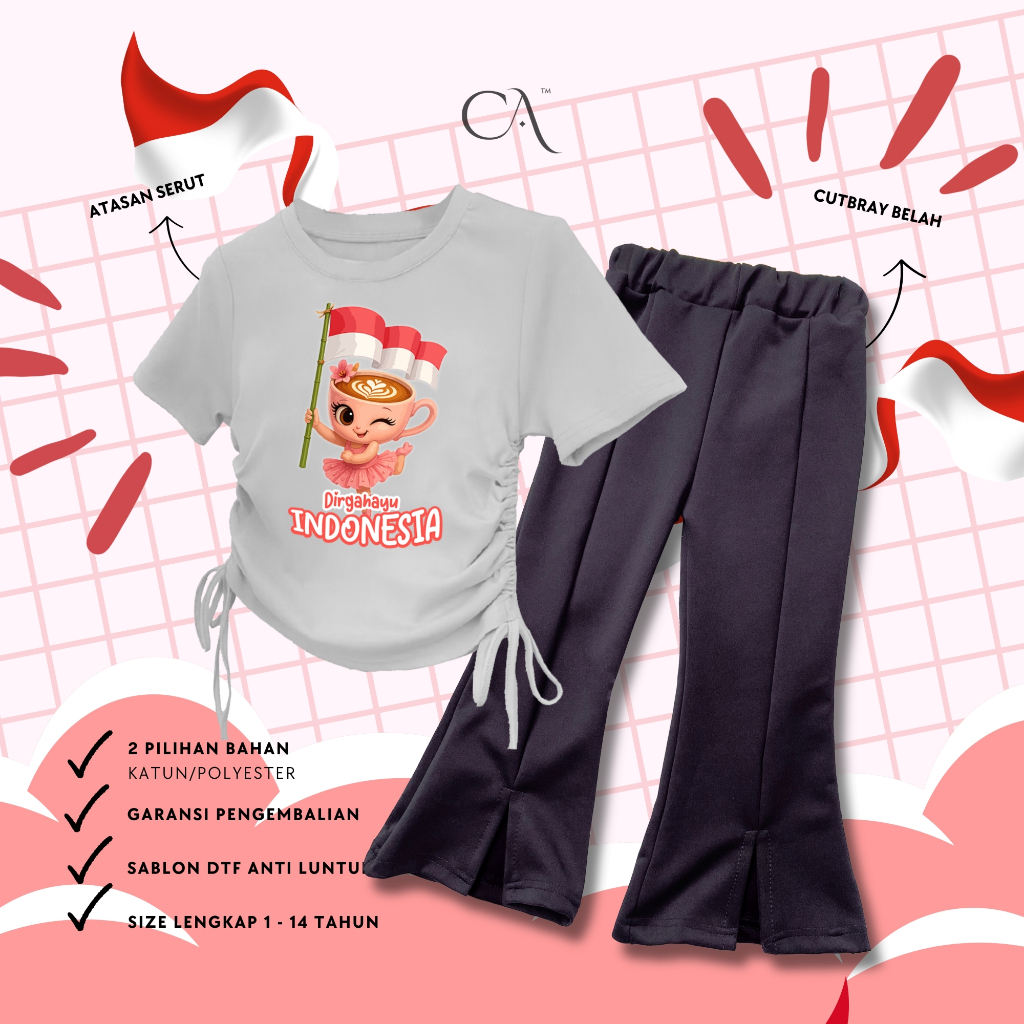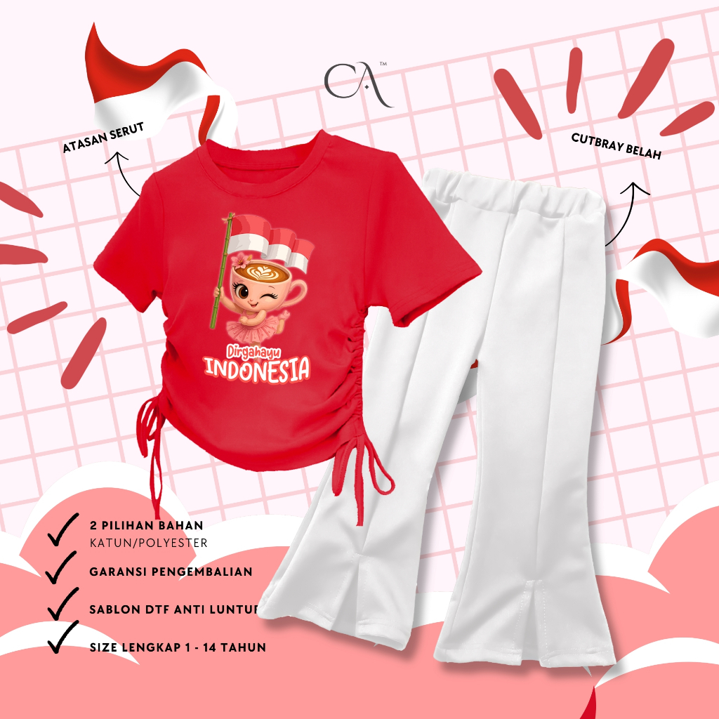 Setelan Kaos Serut Crop Top dan Cutbray Belah Anak Perempuan Anomali Kemerdekaan Indonesia Umur 1-14 tahun