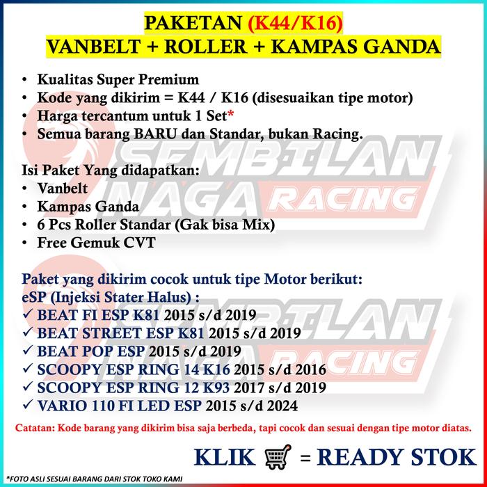 PAKET VANBELT KAMPAS GANDA ROLLER STANDAR BEAT FI ESP SCOOPY ESP RING 12 14 VARIO 110 LED ESP K44 K16 - BEAT ESP, 2015-2016
