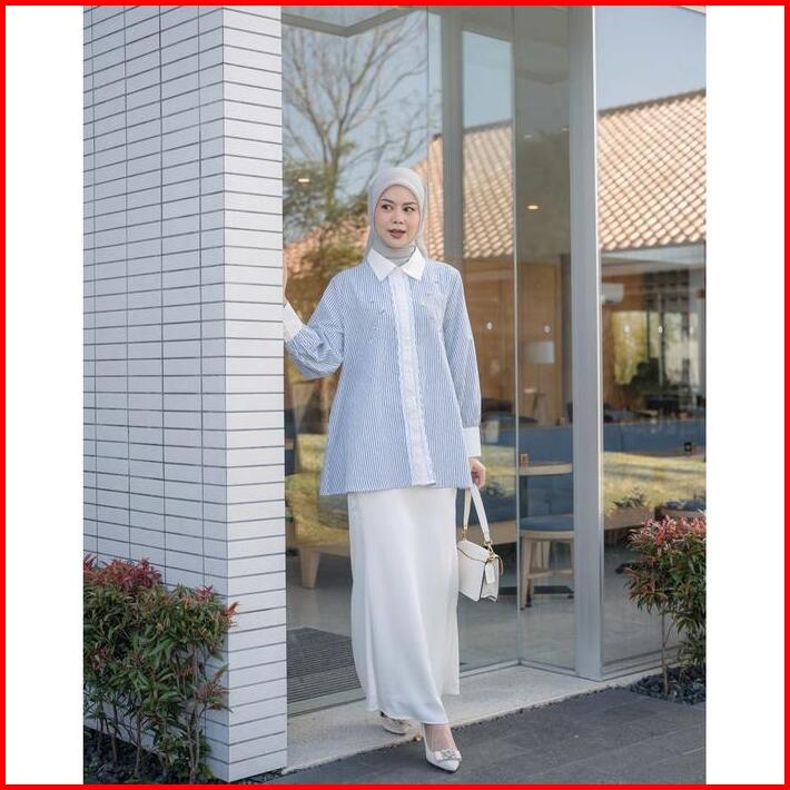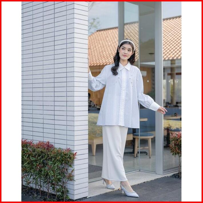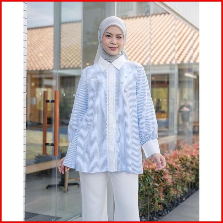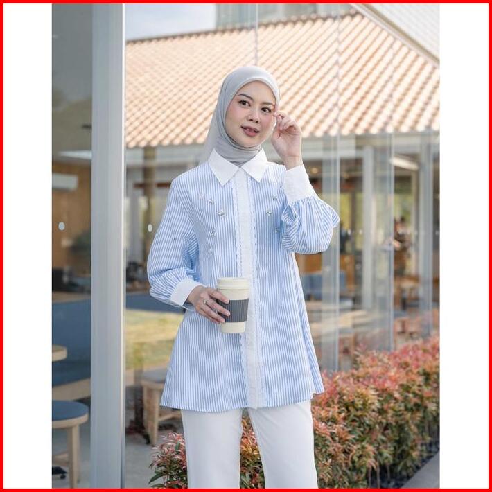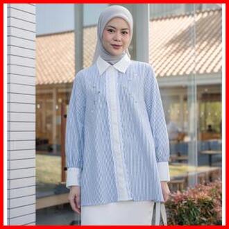 Mayoutfit Daniesha Shirt Kemeja Wanita Katun Stripe Aksen Payet Beads Kombi Renda Lace Brukat