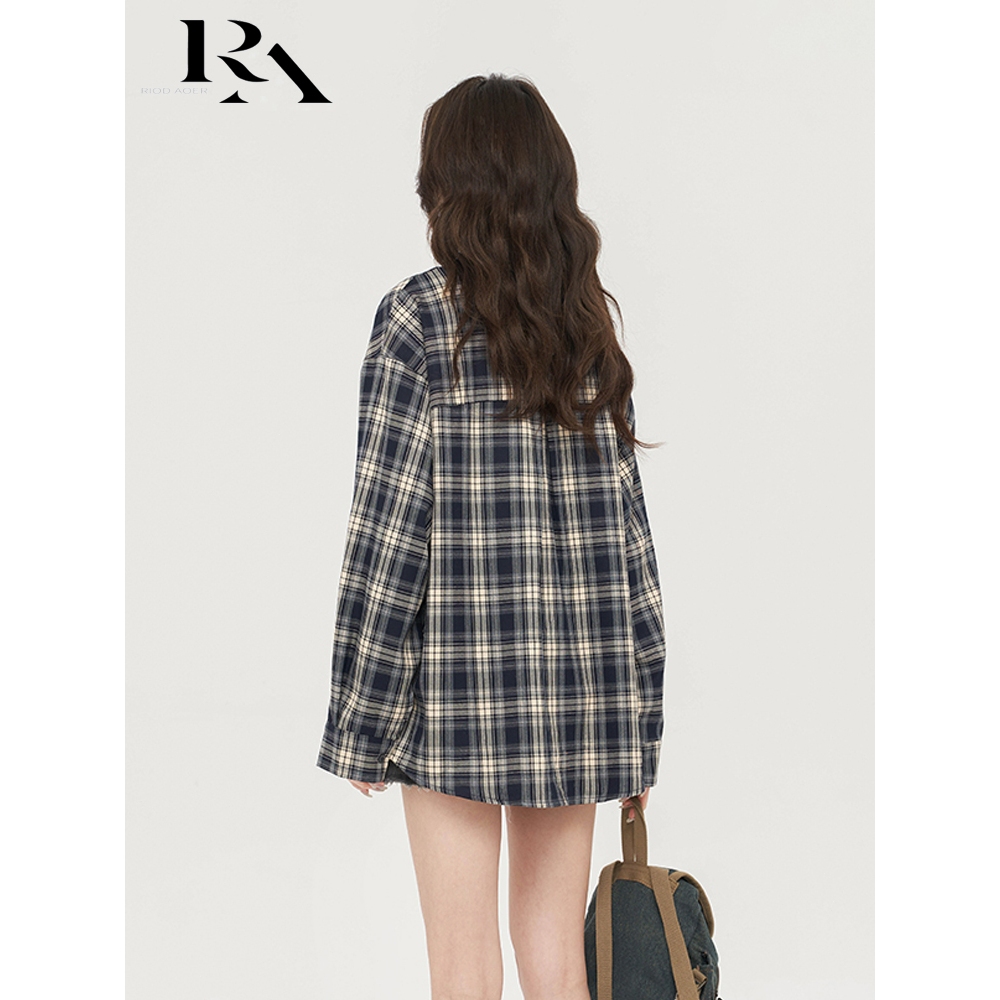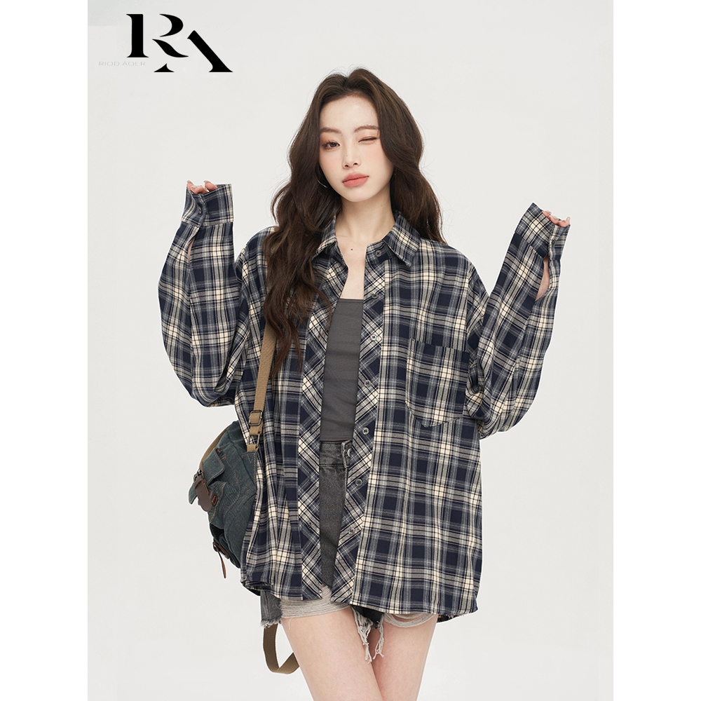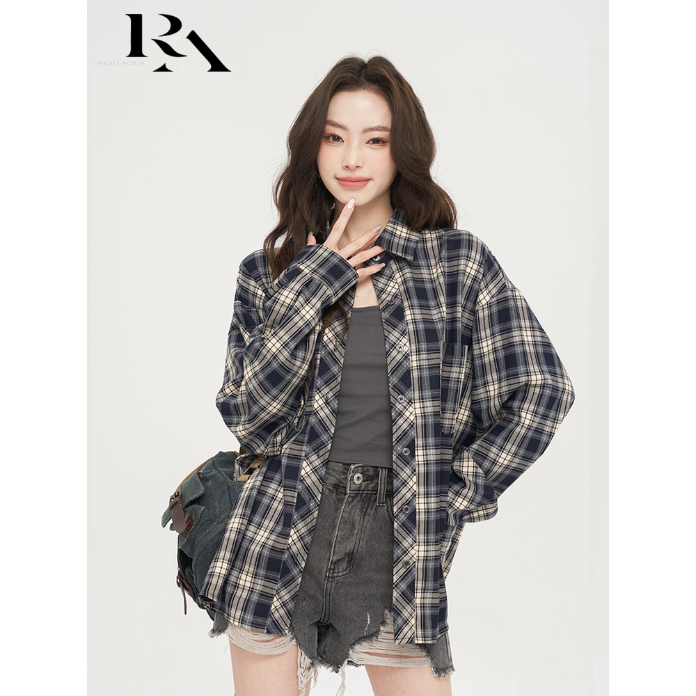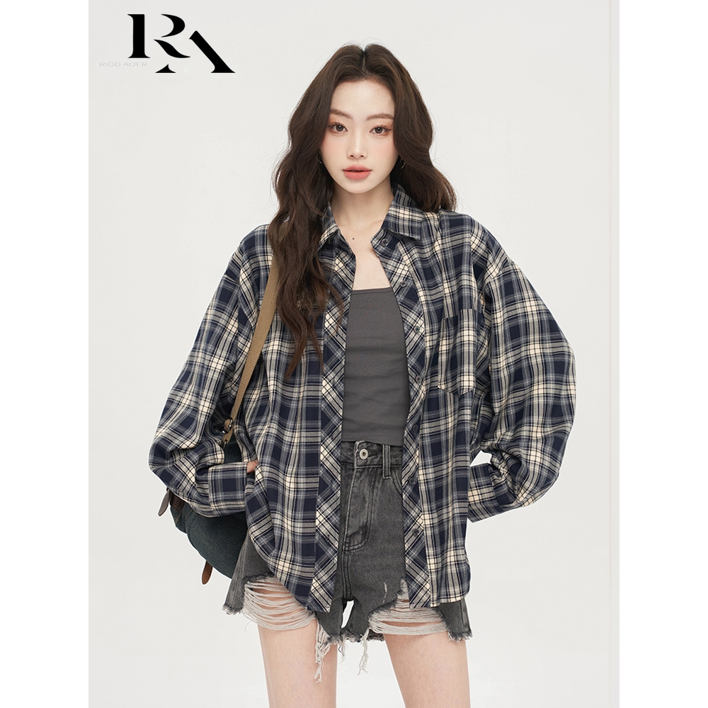 RIOD AOER blouse wanita Jaket kemeja kotak-kotak baru untuk wanita ukuran kecil longgar dan ramping serbaguna berla