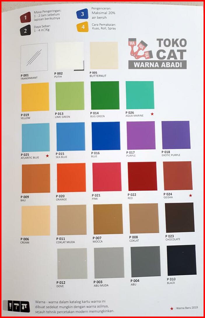 TRANSPARANT, PUTIH P002, BUTTERNUT P005, YELLOW P019, LIME GREEN P013, BUG GREEN P014, AQUA MARINE, ATLANTIC BLUE, SEA BLUE P015, BLUE P016, PURPLE P017, EXOTIC PURPLE, BALI P009, ORANGE P020, PINK P021, RED P022, GEISHA P024, CREAM P006, COKLAT MUDA, MOCCA P007, COKLAT P008, CHOCOLATE P023, DOVE P012, ABU MUDA P003, ABU P004, BLACK P010