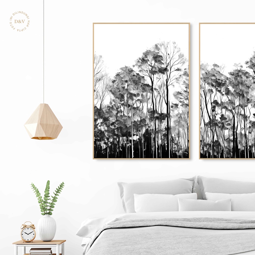 Hiasan Dinding Ruang Tamu Minimalis 80x57cm & 40x57cm Forest Lake Monochrome Black White INCLUDE FRAME - Hiasan dinding
