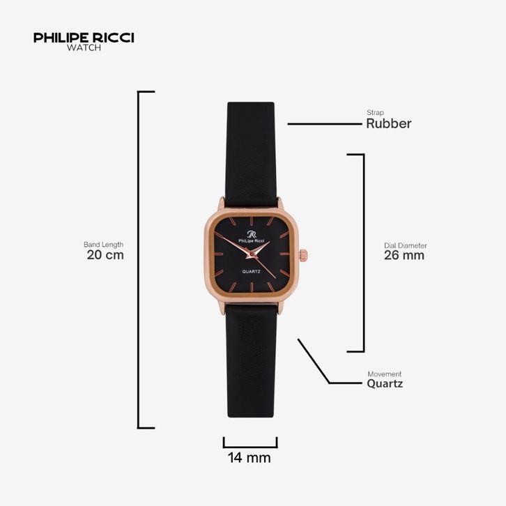 PhiLipe Ricci Jam Tangan Wanita Kulit Kecil Aesthetic Kotak Original 7487 Jam Cewek Mini Rose Hitam