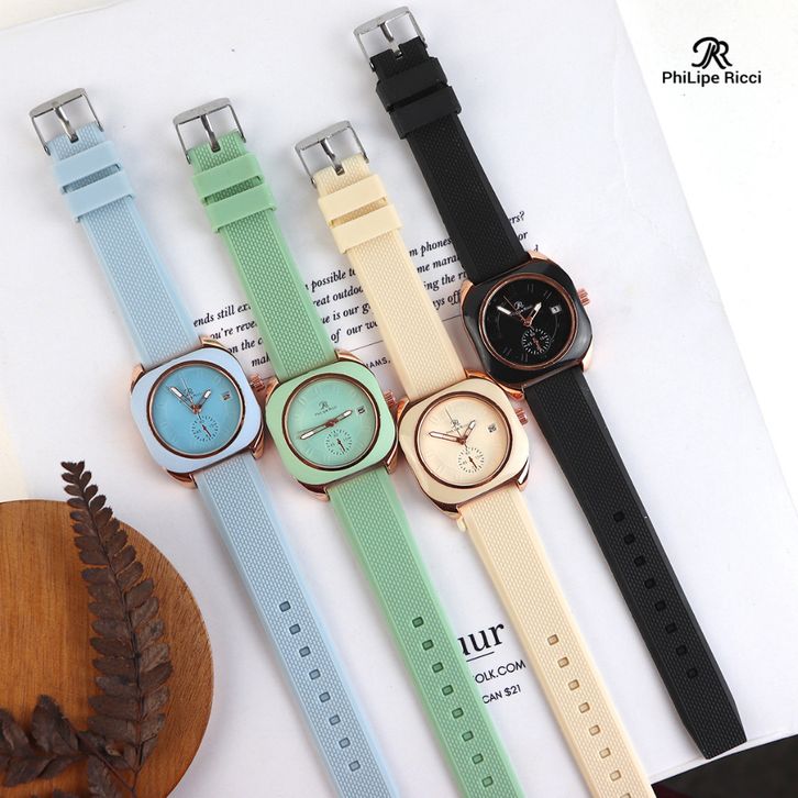 PhiLipe Ricci Jam Tangan Wanita Analog Tanggal Aktif Diameter Kotak Strap Tali Karet Kecil Korea Style 8899 Free Box