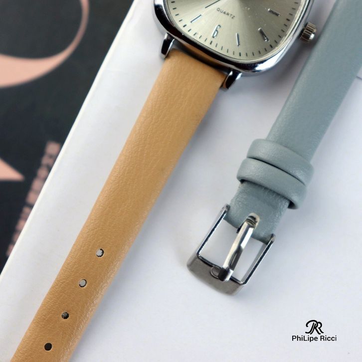 PhiLipe Ricci Jam Tangan Wanita Kotak Strap Tali Kulit Kecil Analog Imut Modern Terbaru Original 4232 Free Box