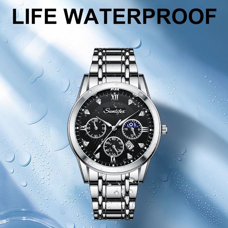 Sunlifex Jam Tangan Pria Original 9004A Kuarsa Calendar Tali Stainless Steel Mode Santai Jam Tangan Cowok