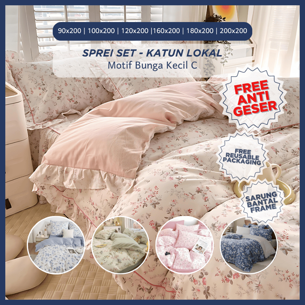 Sprei Set Homemade Katun Lokal Premium Adem Anti Geser Motif Bunga Kecil Aesthetic C 160x200 180x200