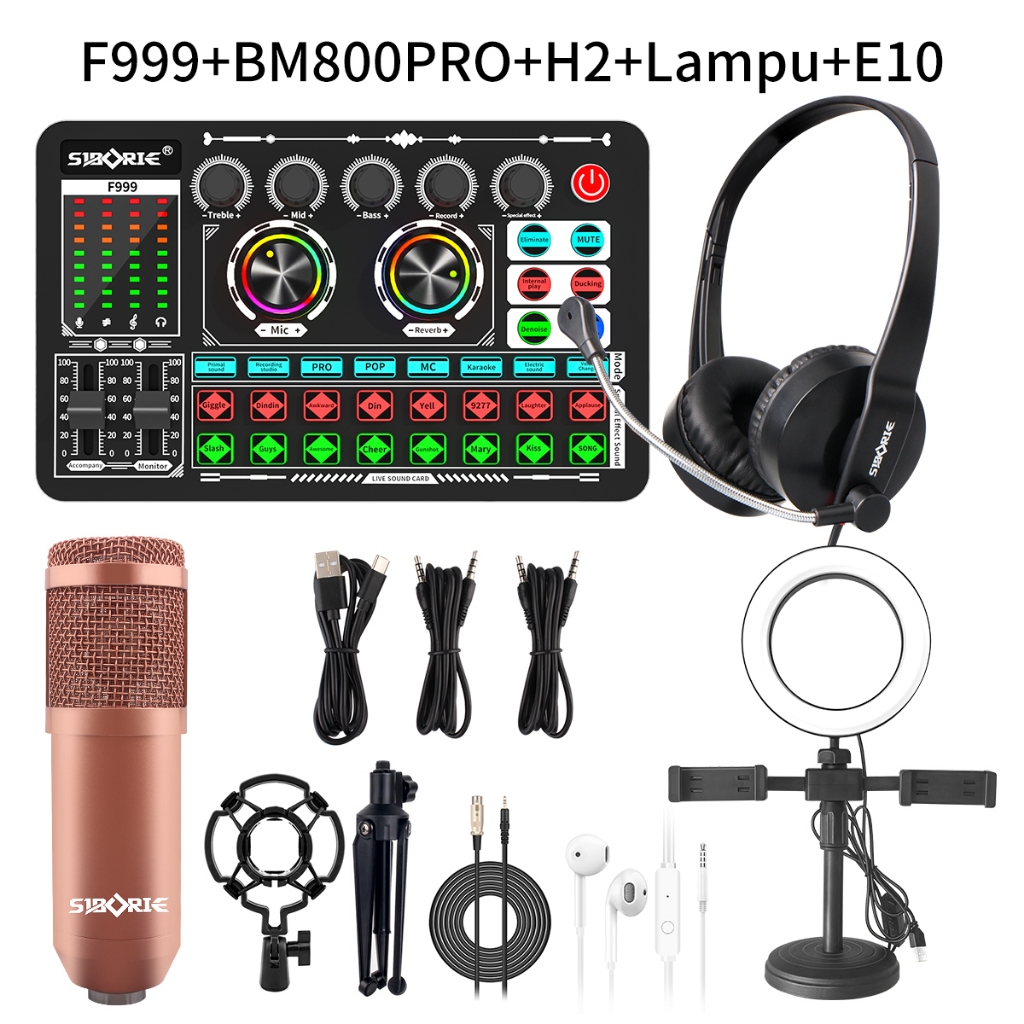 Siborie Soundcard F999+BM800PR0 Mic+H2 Headphone+Lampu Paket Lengkap With Free Headset For Streaming Media