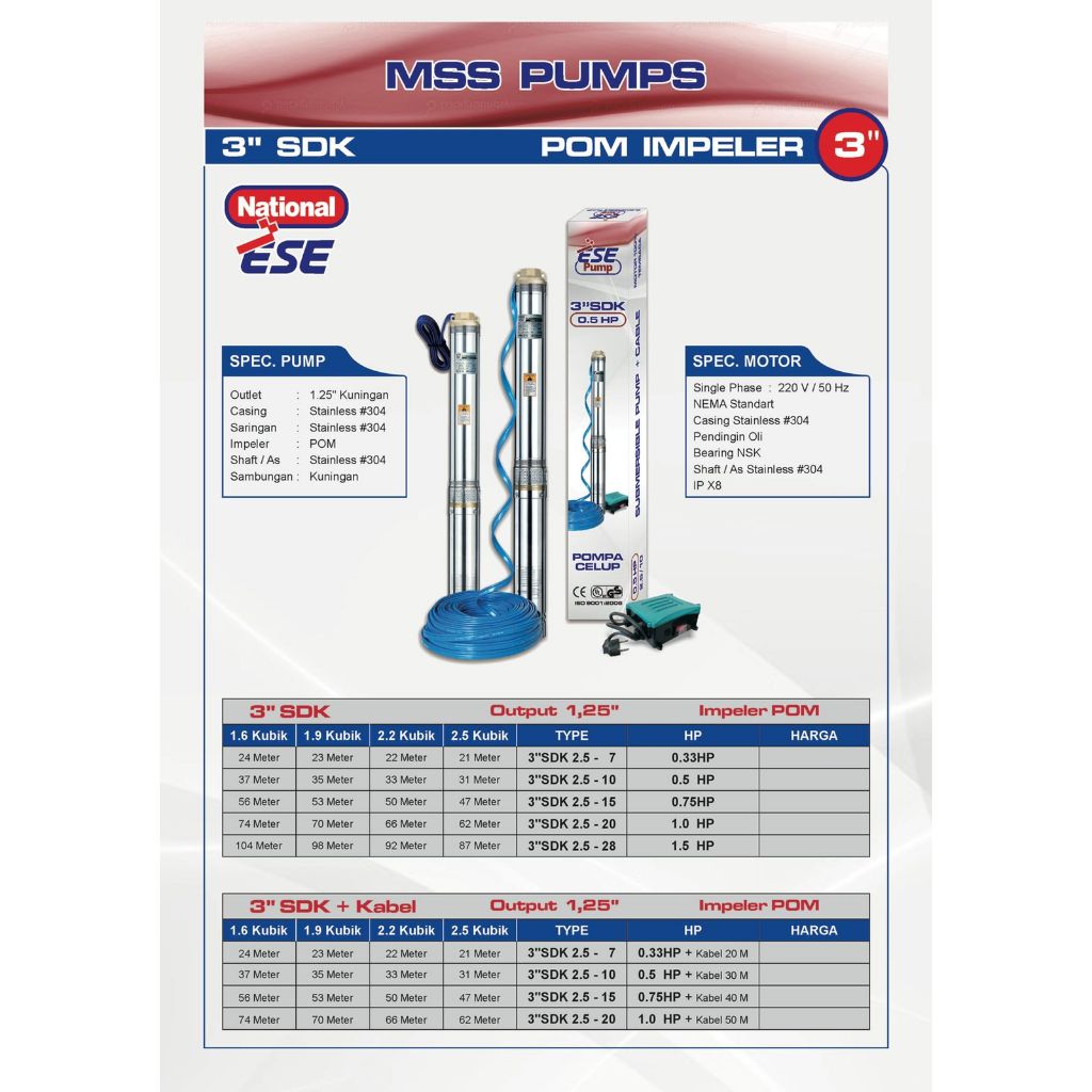 Pompa Satelit Ese National 3"SDK 0,25Hp dan 0,33Hp dan 0,5Hp dan 0,75Hp dan 1Hp+Kabel Submersible Pump Pompa sibel 3 Inc