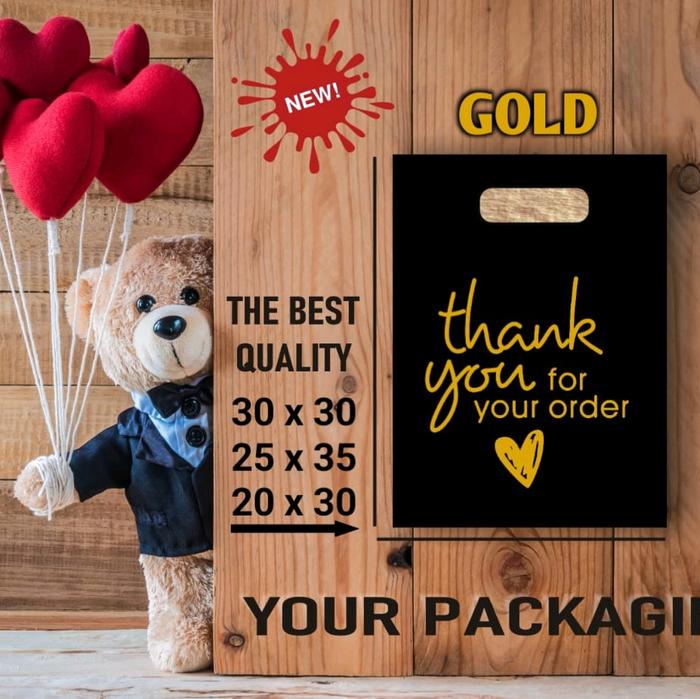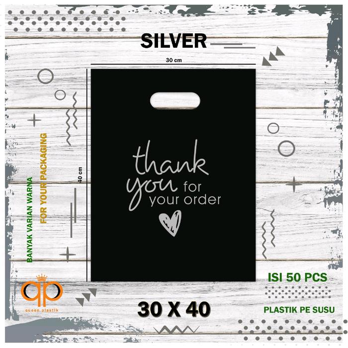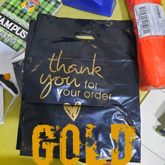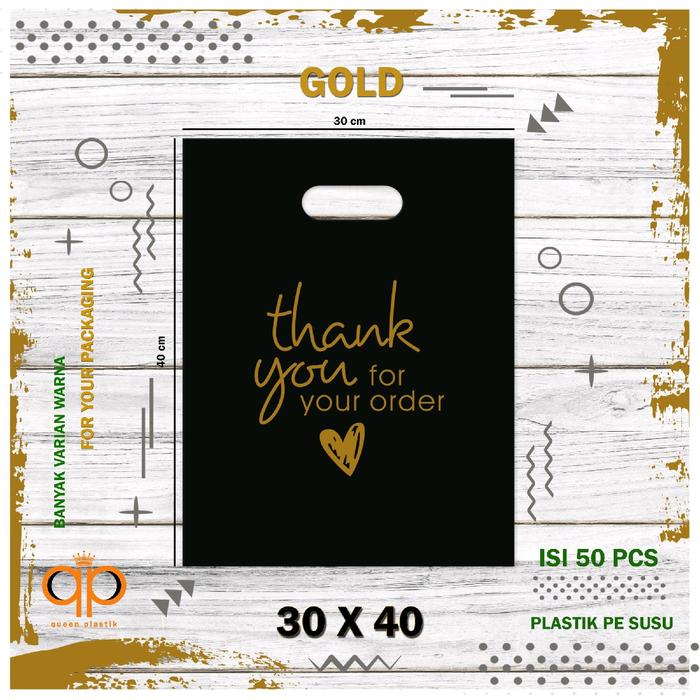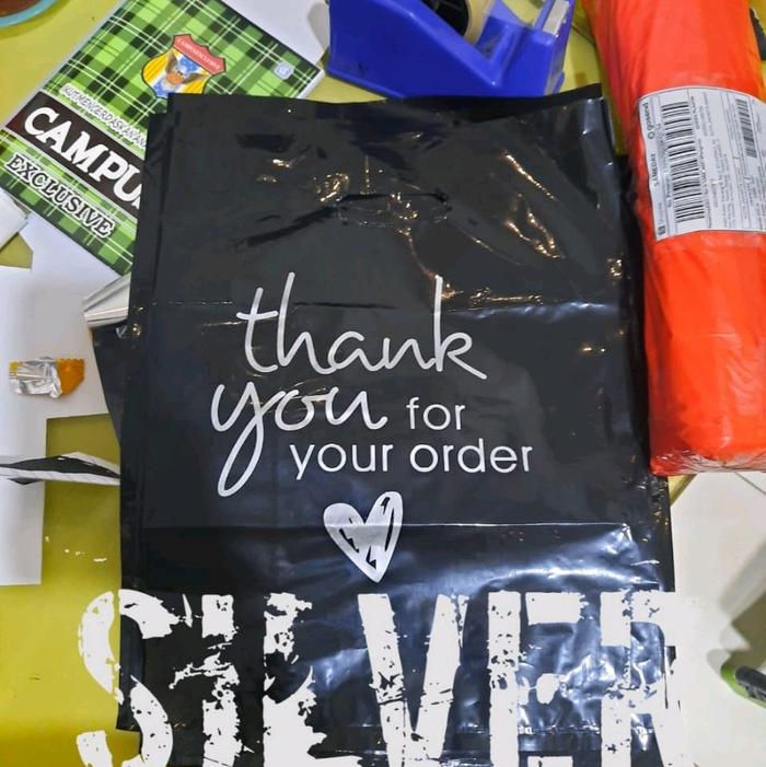 DP 0 (PE HITAM ISI 50PCS UK 30X40) KANTONG PLASTIK MOTIF THANK YOU UNTUK BAJU PAKAIAN HIJAB