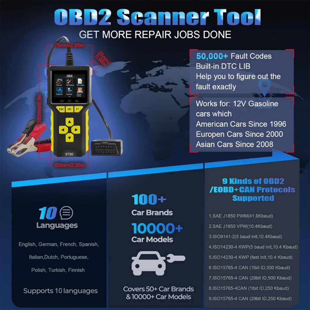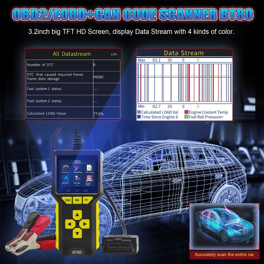 BT80 2 IN 1 OBD2 II Scanner Mobil dan Battery Baterai tester Pembaca Cek Kode Diagnostic OBD 2 BT 80 BT-80 Error Code Ch
