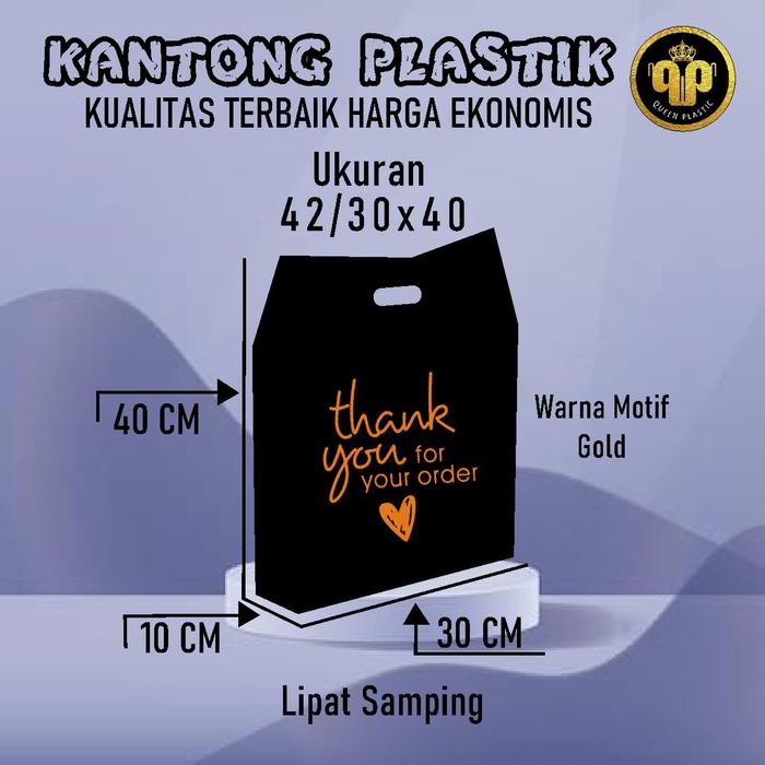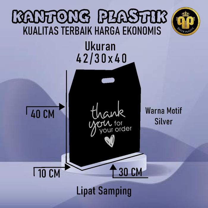 DP 0 KANTONG PLASTIK PE HITAM UK 4230X40 MOTIF THANK YOU LIPATAN SAMPING PE HITAM SILVER 4