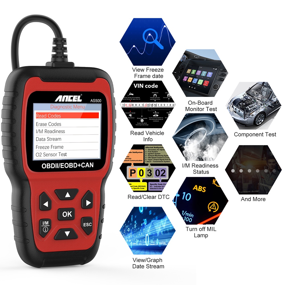 Ancel AS500 Pemindai diagnostik otomatis OBD2 Alat pembacaan dan pembersihan kode kesalahan mesin