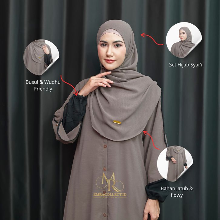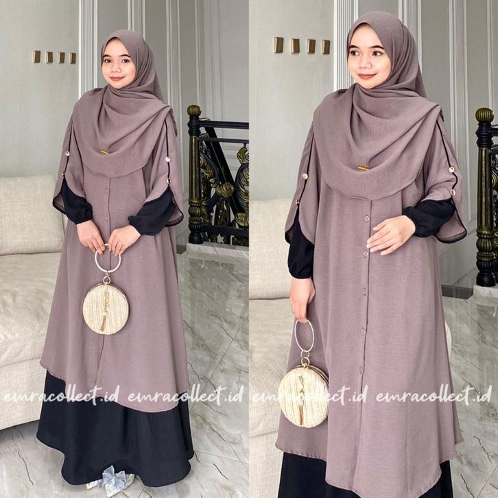 Baju Gamis Wanita Terbaru 2025 Tunik Syar’i Full Kancing Set Rok Tunik Malaya Burgundy Set Pashmina Oval