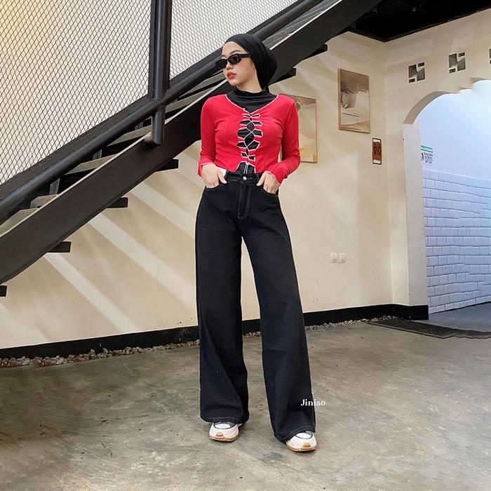 JINISO WEEKEND - 677 Highwaist Oversize Baggy Loose Celana Jeans Wanita Warna Black Gold