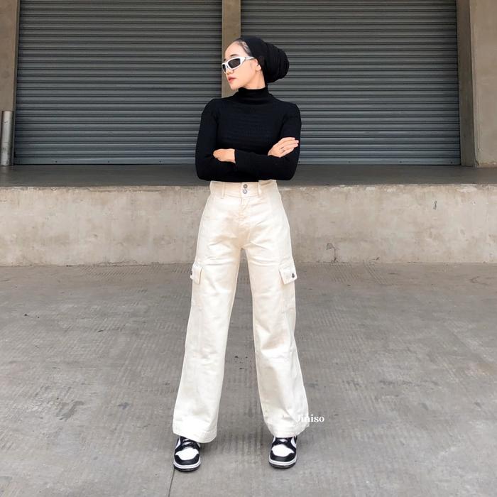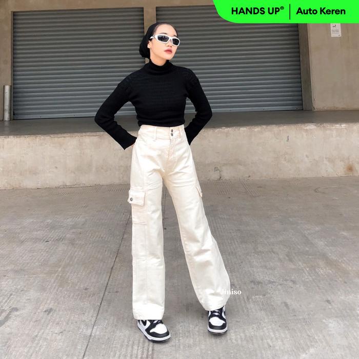 JINISO HANDS UP - 403 Cargo Loose Highwaist Celana Jeans Wanita Warna Khaki