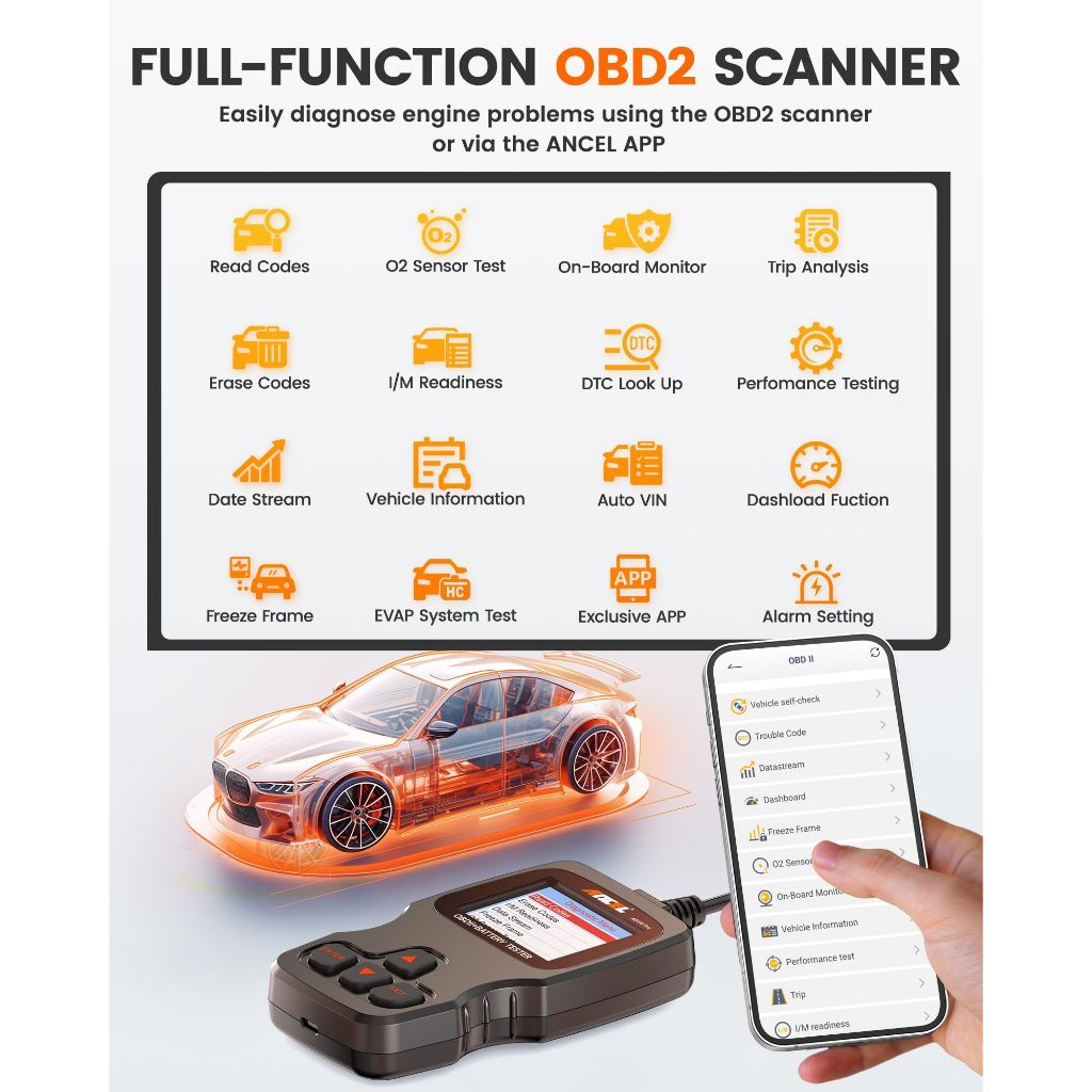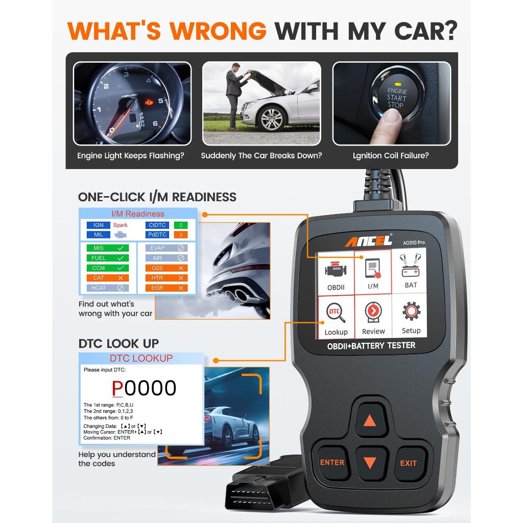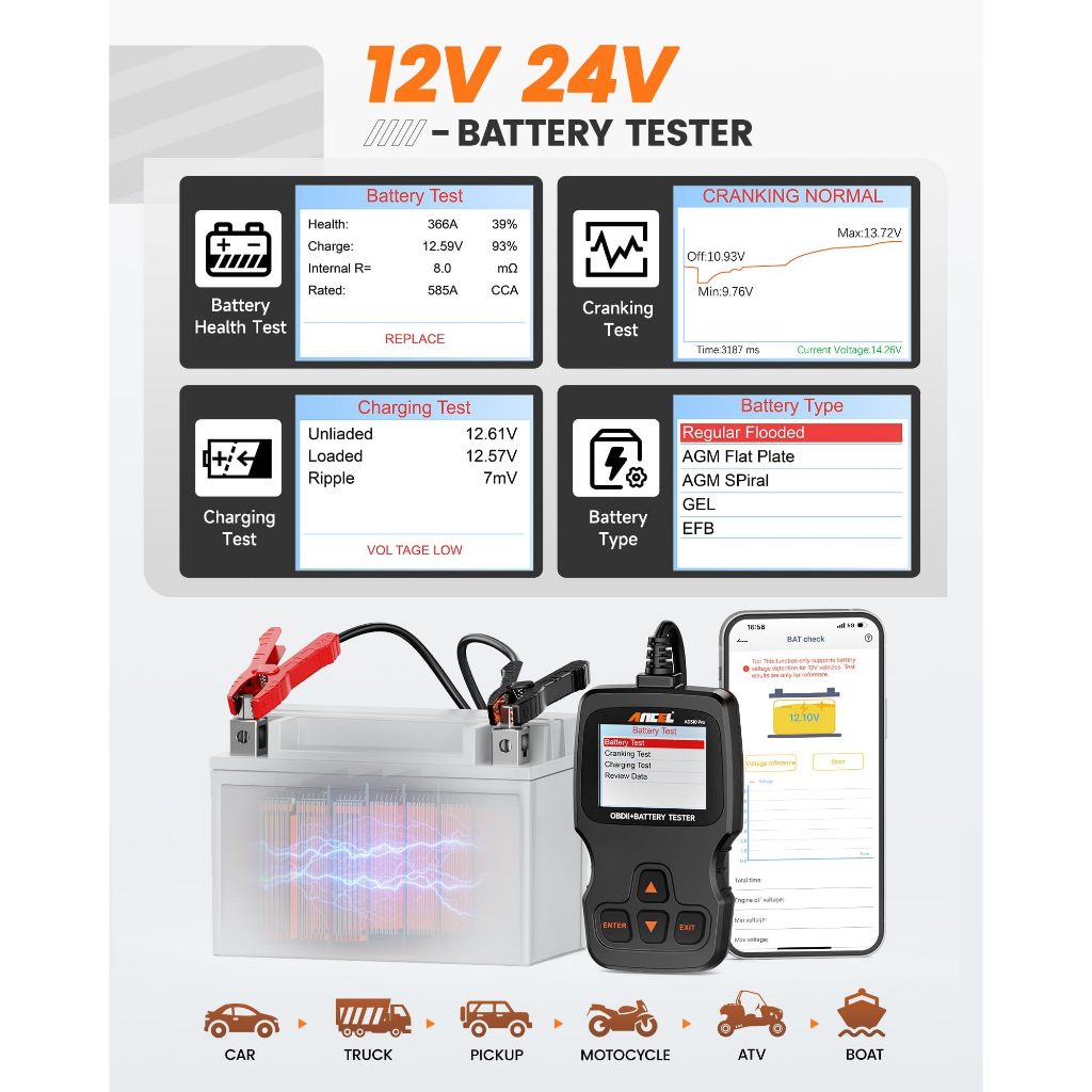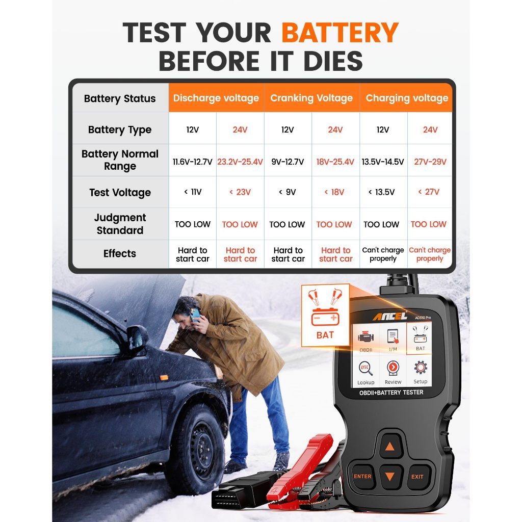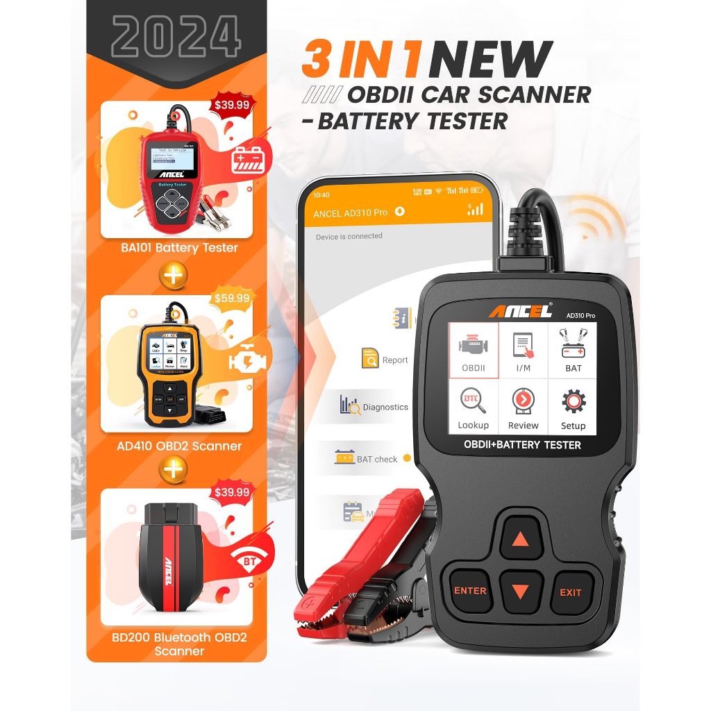 ANCEL AD310 Pro 3 in 1 OBD2 Scanner Battery Tester, Pembaca Kode Mobil Bluetooth dengan Aplikasi, Baterai 12V 24V 100-20