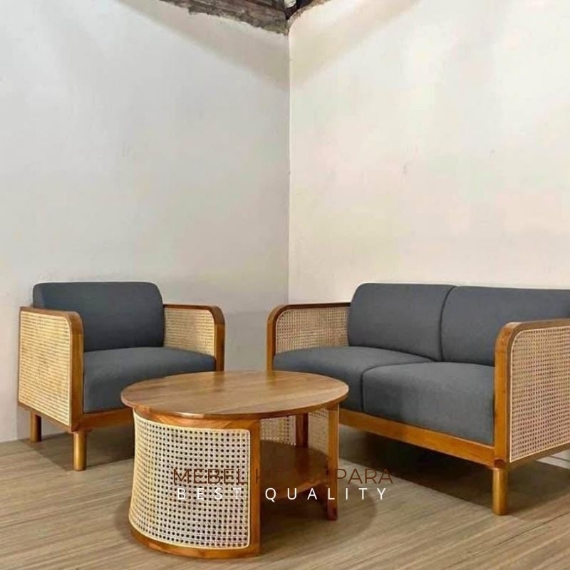 Sofa minimalis modern Japandi | Ruang Tamu Aesthetic Kayu Jati Kombinasi Anyaman Rotan