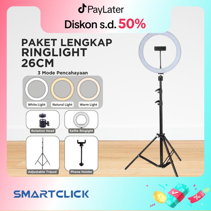 DP 0 PAKET KOMPLIT RINGLIGHT 26CM + TRIPOD 21 METER MAKE UP VLOG LAMPU RINGLIGHT TRIPOD 31