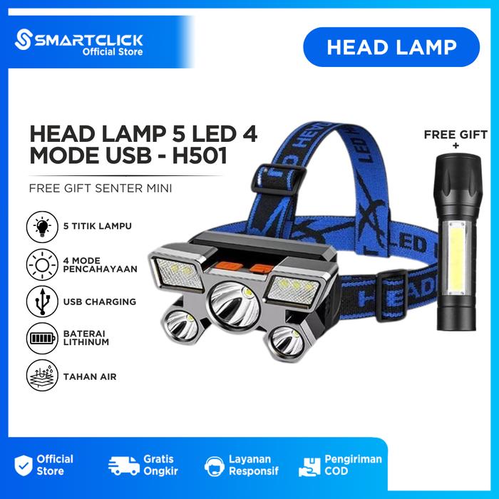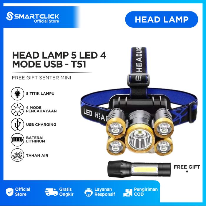 DP 0 SENTER KEPALA SUPER TERANG HEADLAMP 5 LED RECHARGEABLE FREE SENTER MINI T51 SENTER MI