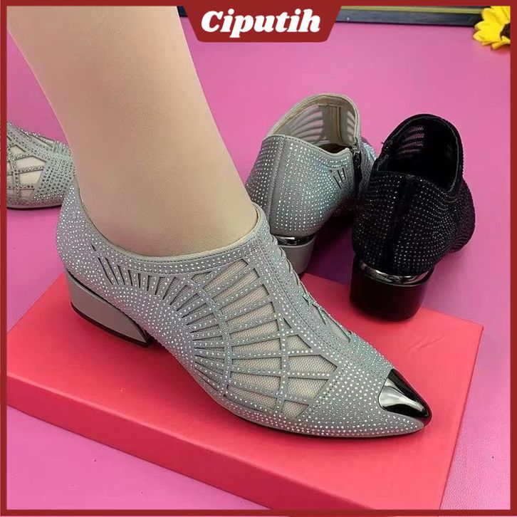Sepatu Dansa Hak Tebal Berujung Tajam Wanita Nyaman Bahan Net Berlian Terpasang Bernapas Sepatu Dansa Ibu