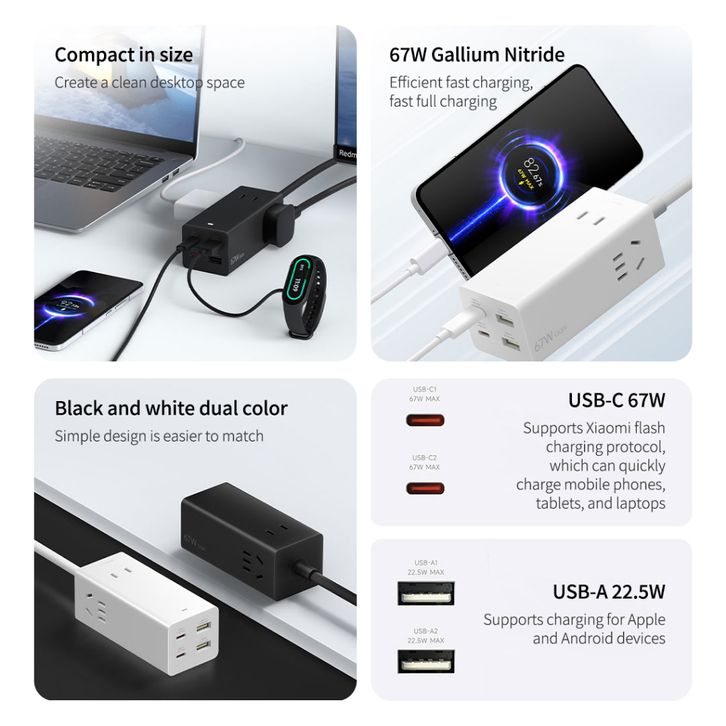 Xiaomi Stopkontak Pengisian Cepat 67W USB-C USB-A 22.5W Pengisi Daya hp 10A 2500W Soket perjalanan