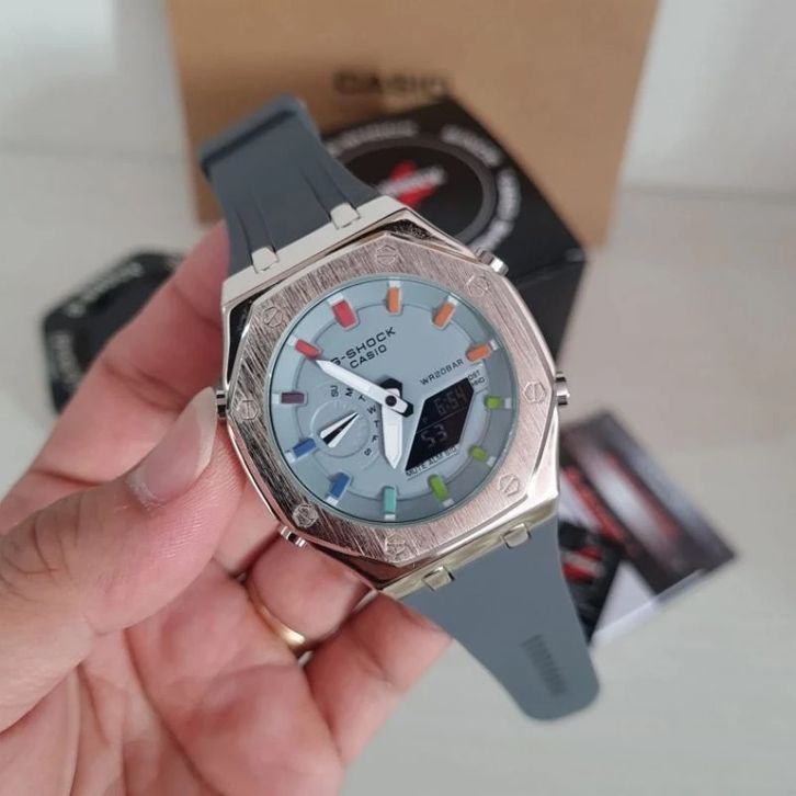 JAM TANGAN PRIA CASIO G-SHOCK GM-2100 SILVER GREY RAINBOW RUBBER FREE ONGKIR - FREE BOX