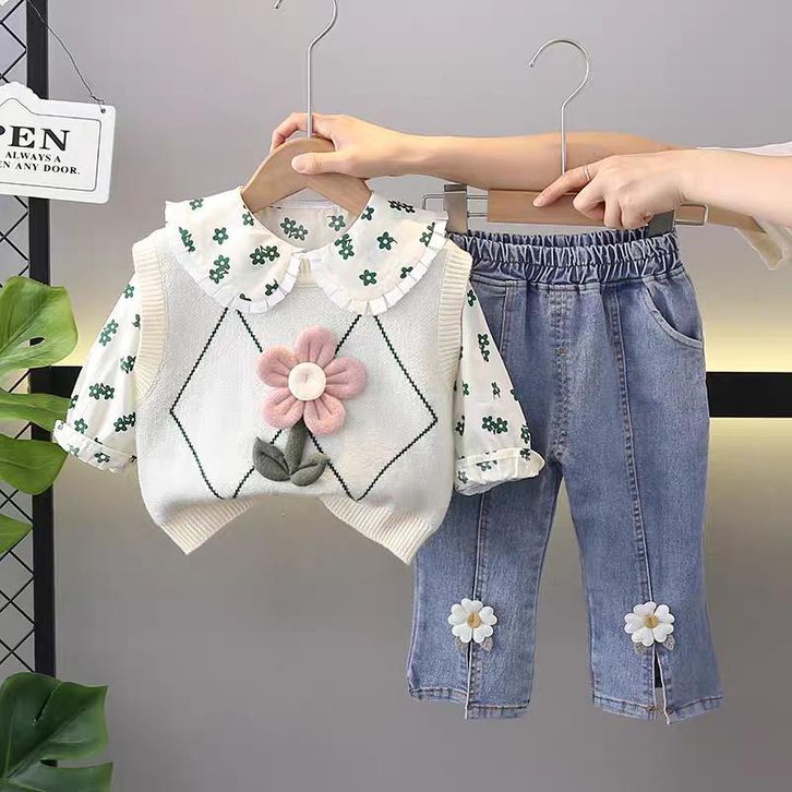 Setelan Anak Perempuan 1-4 Tahun Lengan Panjang Bunga Katun Rajut