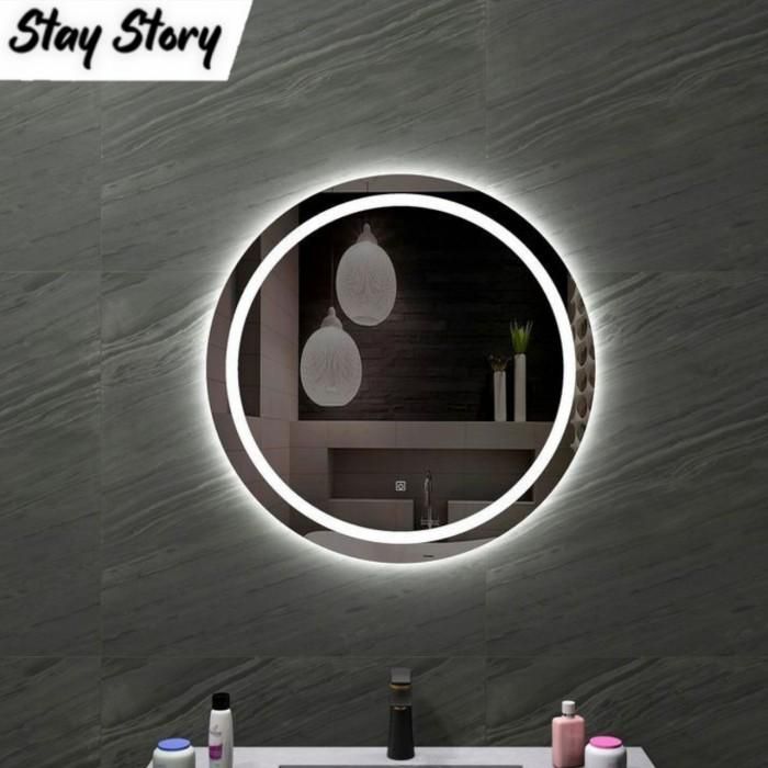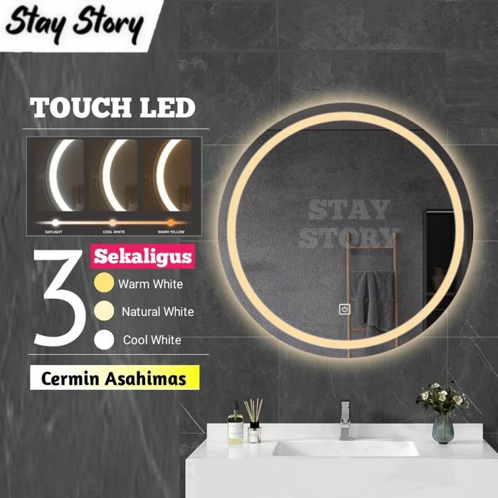 Cermin Wastafel Kamar Mandi Led Touch Screen Kaca Toilet Bulat 3 Warna - 50 cm