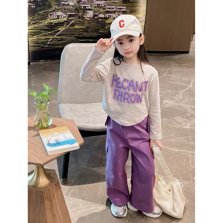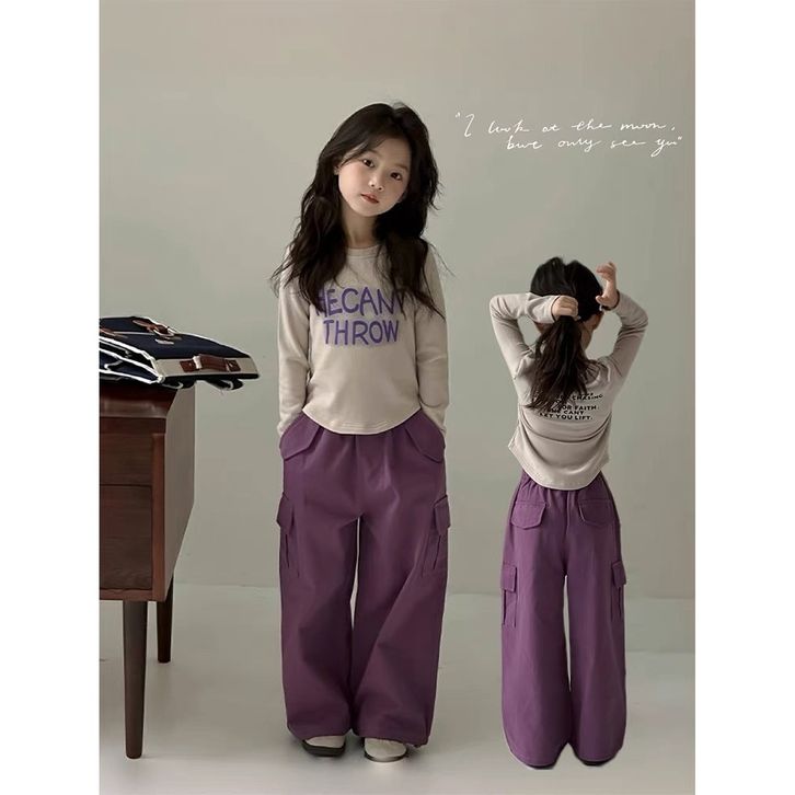 set anak perempuan oneset cargo lengan panjang + celana panjang warna ungu terlaris