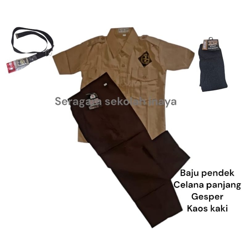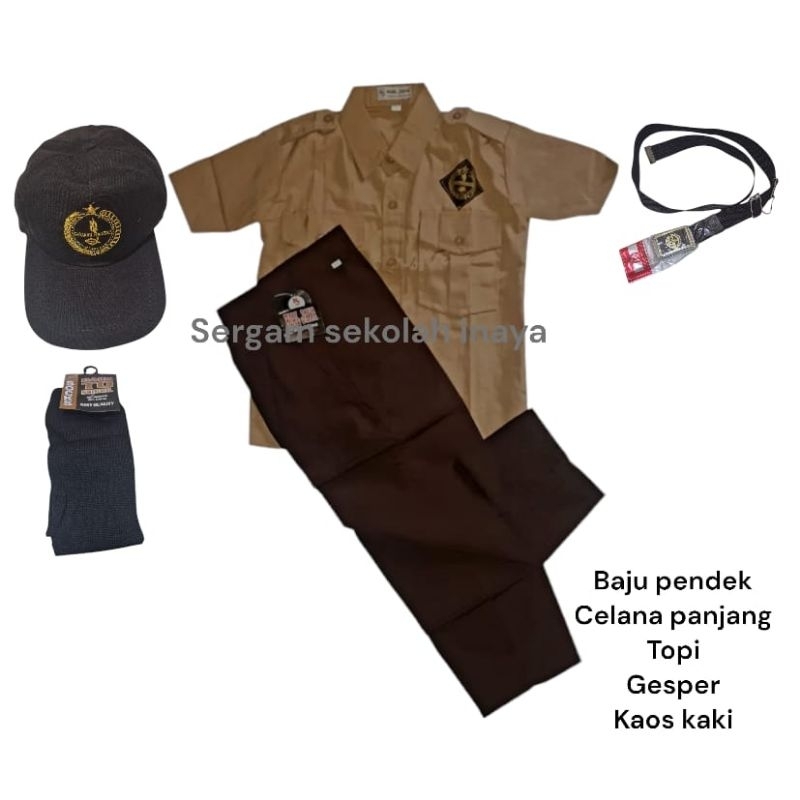 SERAGAM SD SETELAN SET PRAMUKA LAKI LAKI BAJU PENDEK CELANA PANJANG,TOPI,GESPER DAN KAOS KAKI