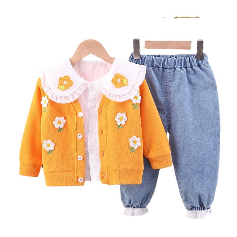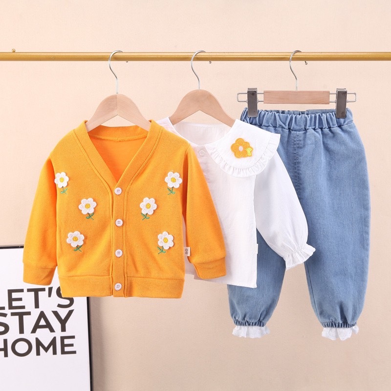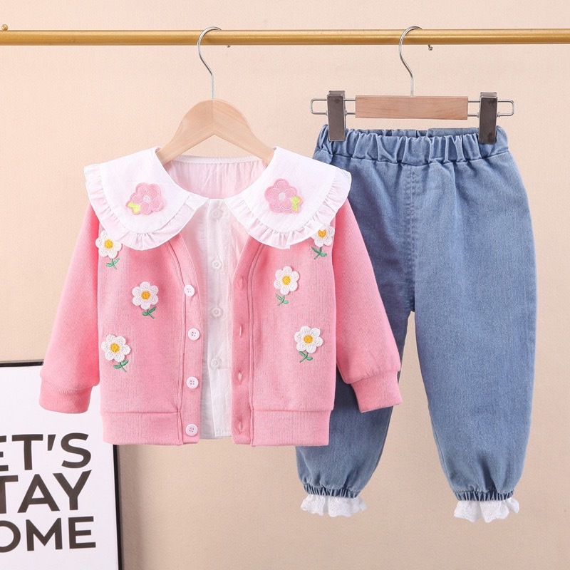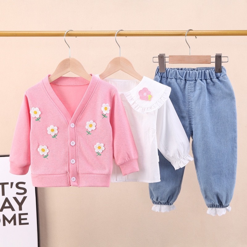 LKM414 Pakaian Set 3in1 Setelan Bayi Pakaian Anak Perempuan Lengan Panjang Motif Bunga + Celana Panjang [1KG 3PC] LITTLE