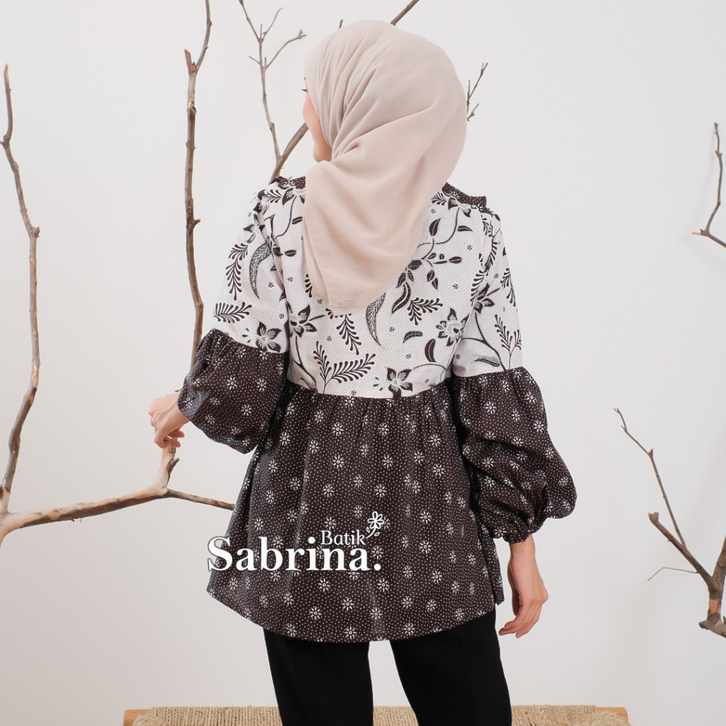 Atasan Batik Wanita Sabrina White Brown Blouse Batik Kerja Wanita Lengan Balon Bahan Katun