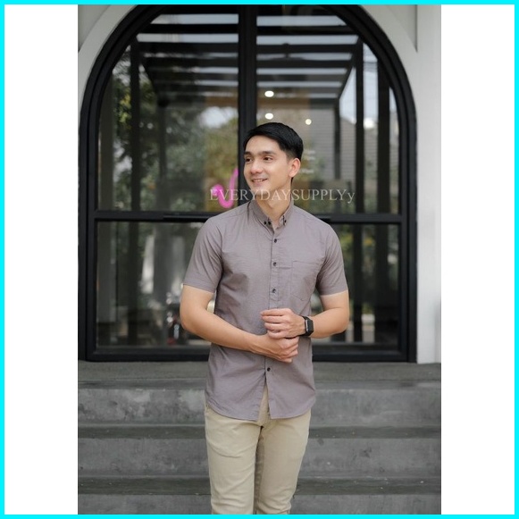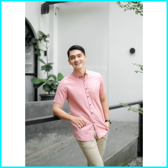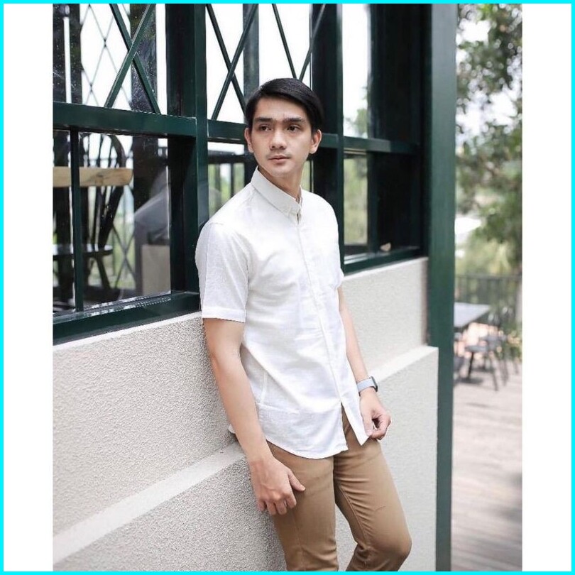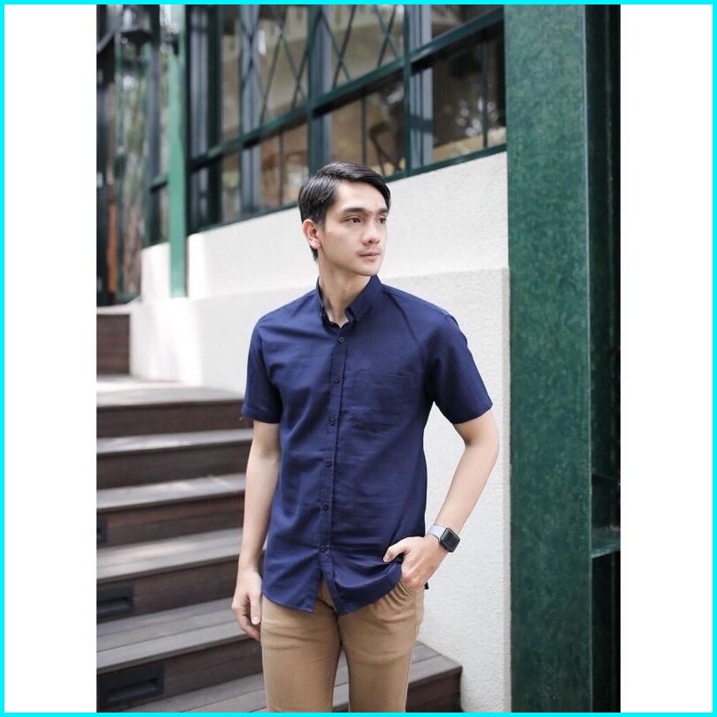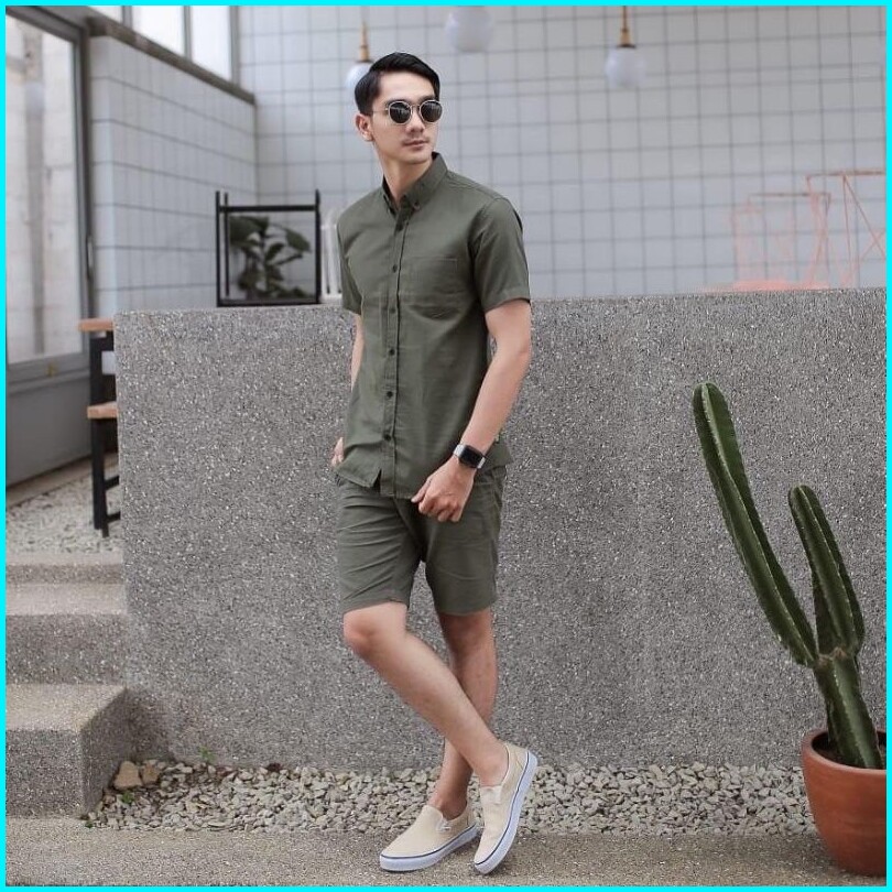 Kemeja Polos Pria Lengan Pendek Slimfit Warna Hijau Army Hitam Putih