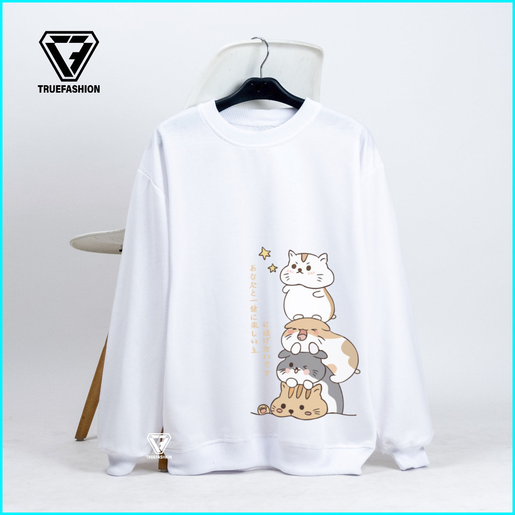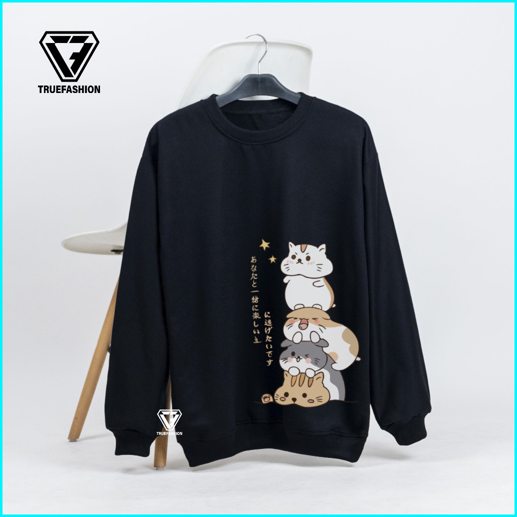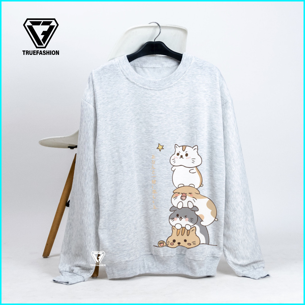 Tf - Four Cat Sweater Wanita Korean Style Sweatshirt Oblong Remaja Family Cat Crewneck Kekinian