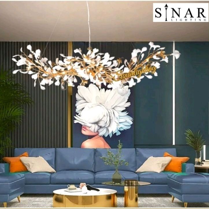 Lampu hias gantung luxury gold and white leaves branches panjang 160 cm D80289
