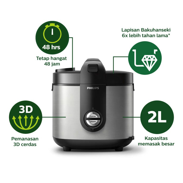 NEW ORIGINAL PHILIPS 2L Rice Cooker HD3138/33 - 400Watt Penanak Nasi Analog, Bakuhanseki Pot, perak, mejikom magic com