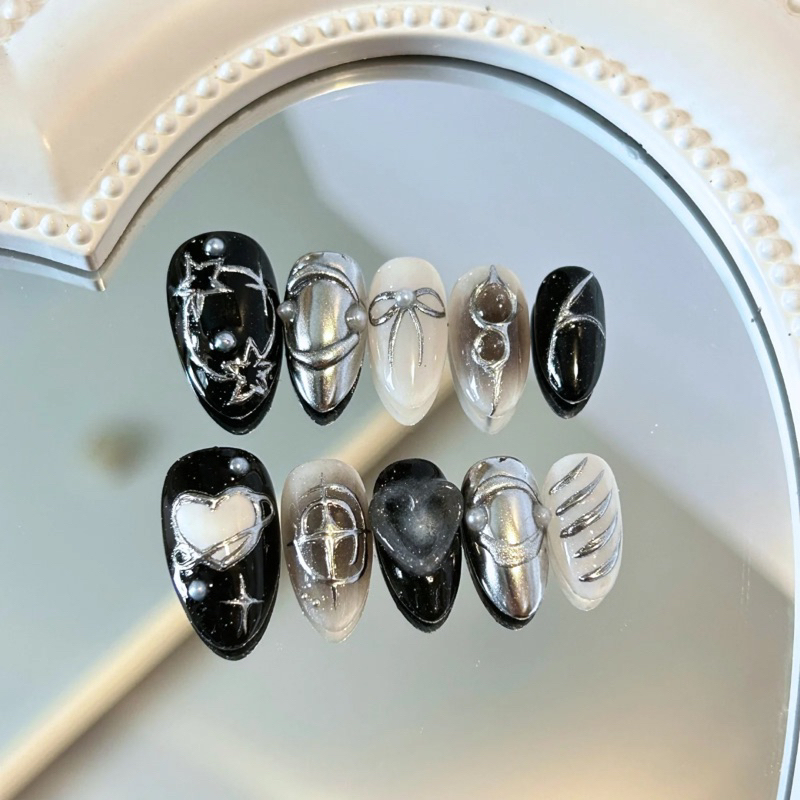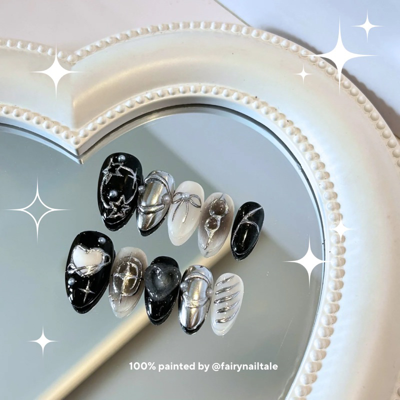 Fairynail Tale - Black Silver Love Y2K Custom Press On Nail Premium Handmade | Fake Nails
