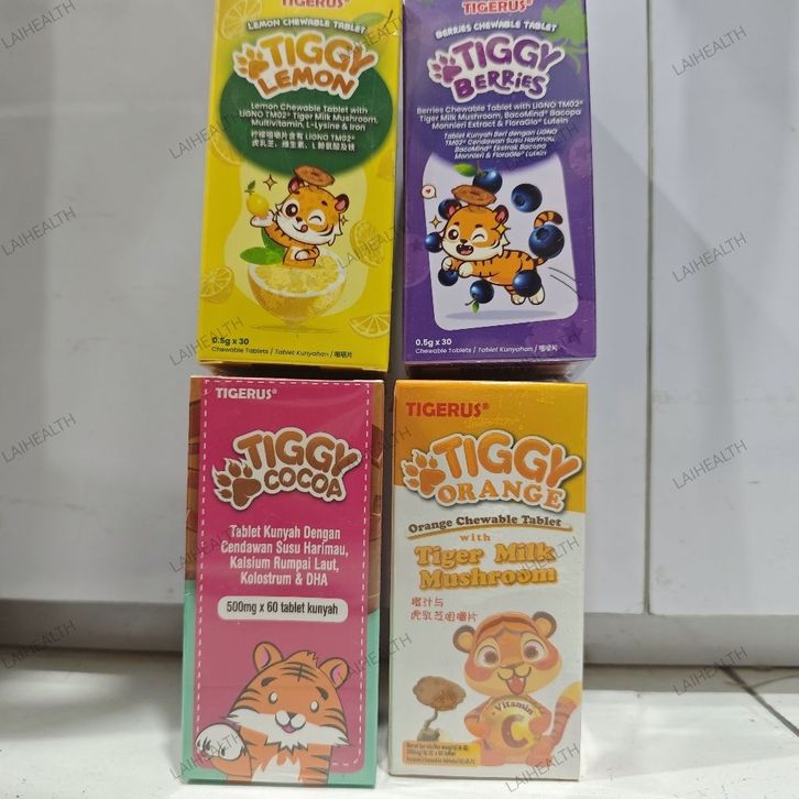 vitamin anak TIGERUS Tiggy orange isi 80s , Tiggy cocoa isi 60s, tiggy berries 60s , tiggy lemon 60s