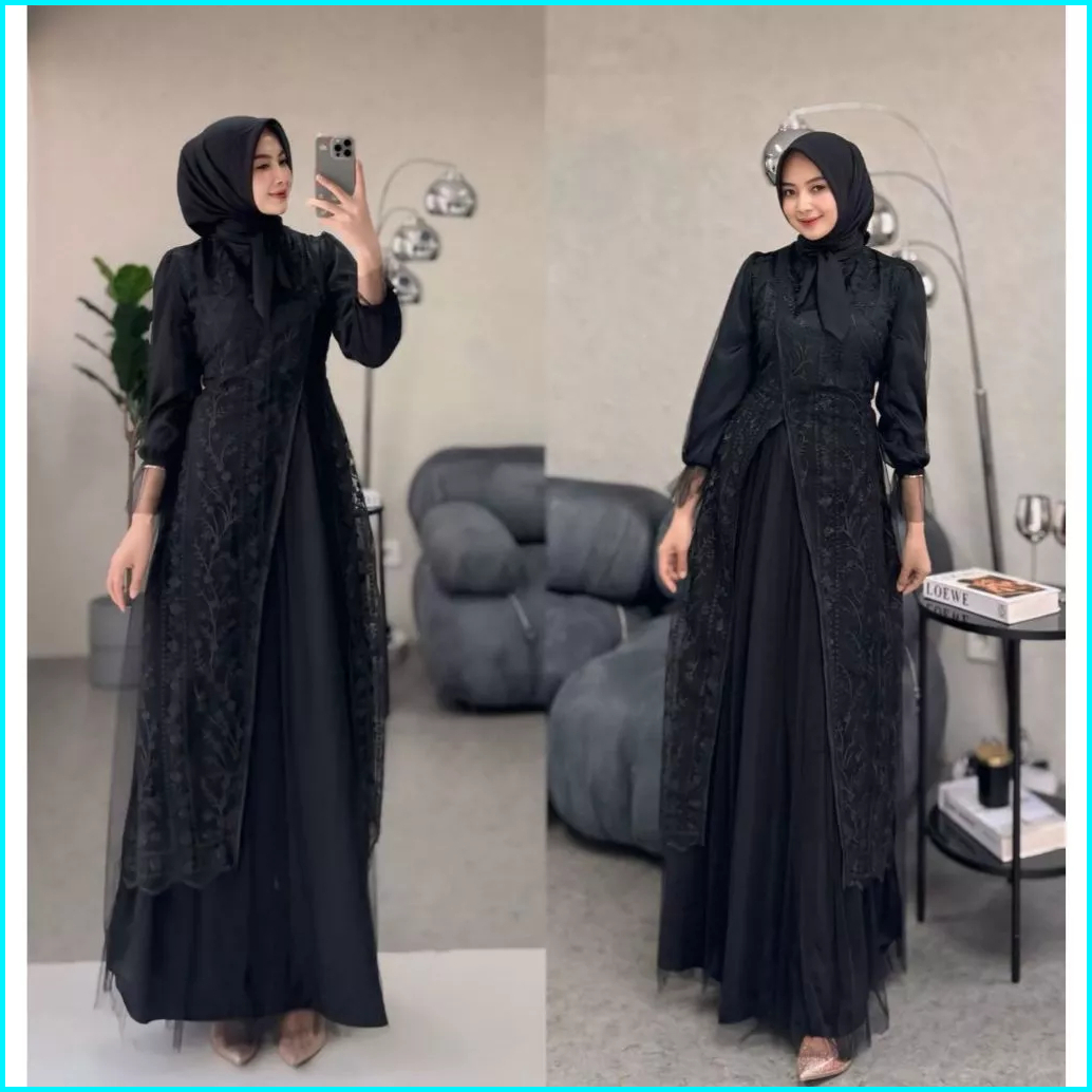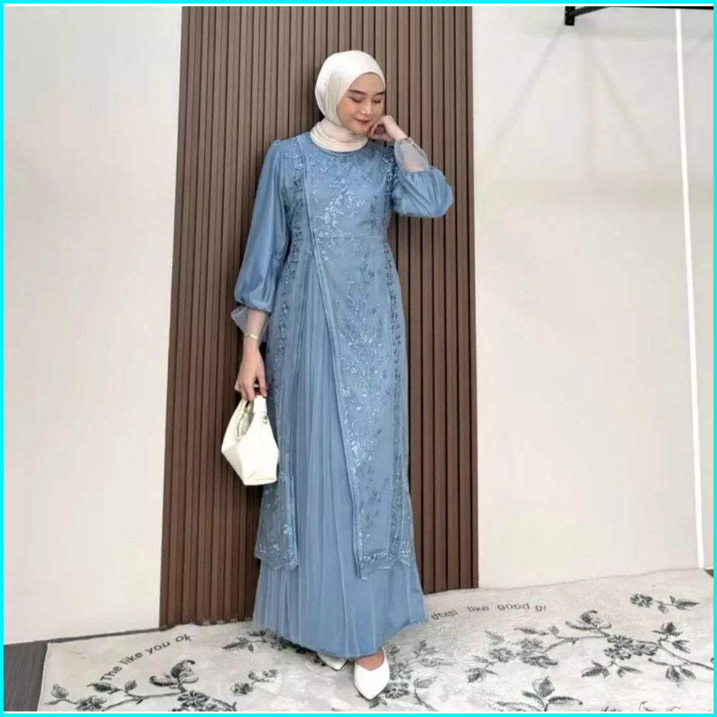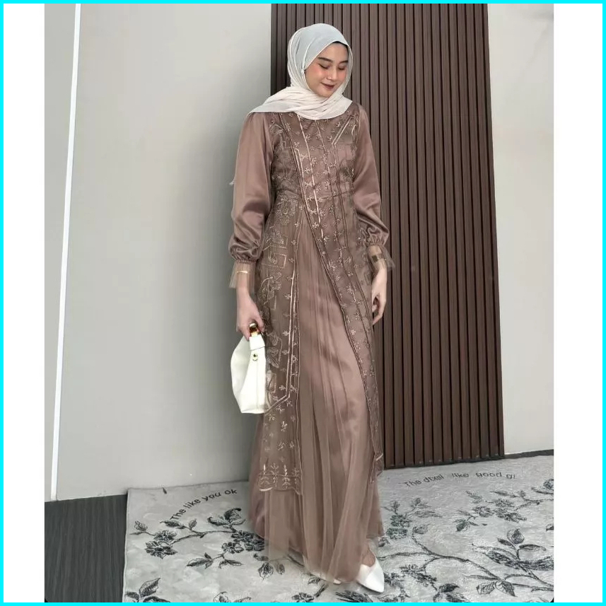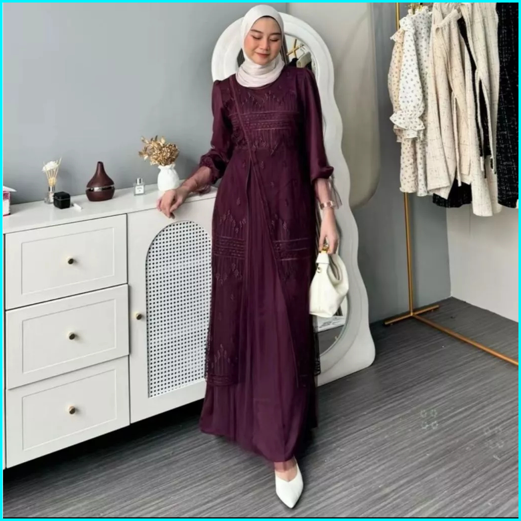 Kinar Dress Silk Kombinasi Tile Garden Premium Warna Burgundy Gamis Brukat Tile Pesta Wanita Mewah