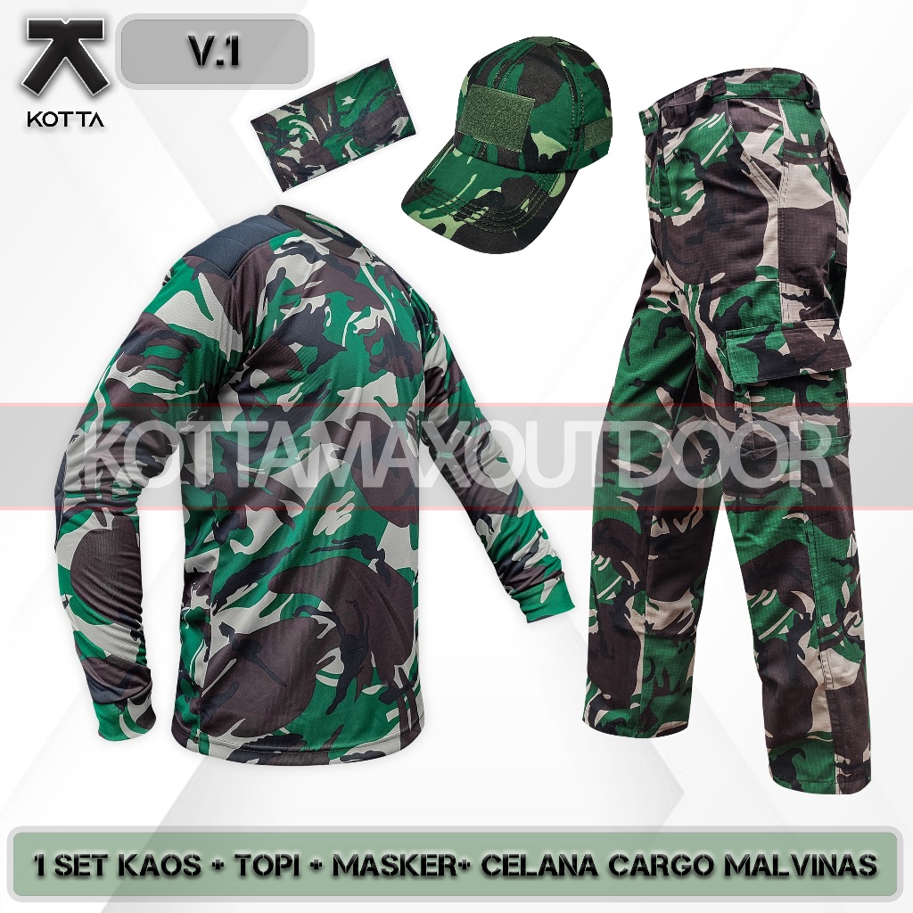 SATU SET SETELAN BAJU KAOS DECKER TOPI BUFF MASKER CELANA PDL PANJANG CARGO KAMUFLASE LORENG TNI MALVINAS