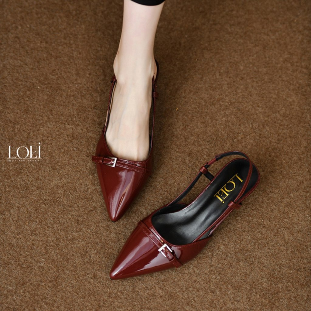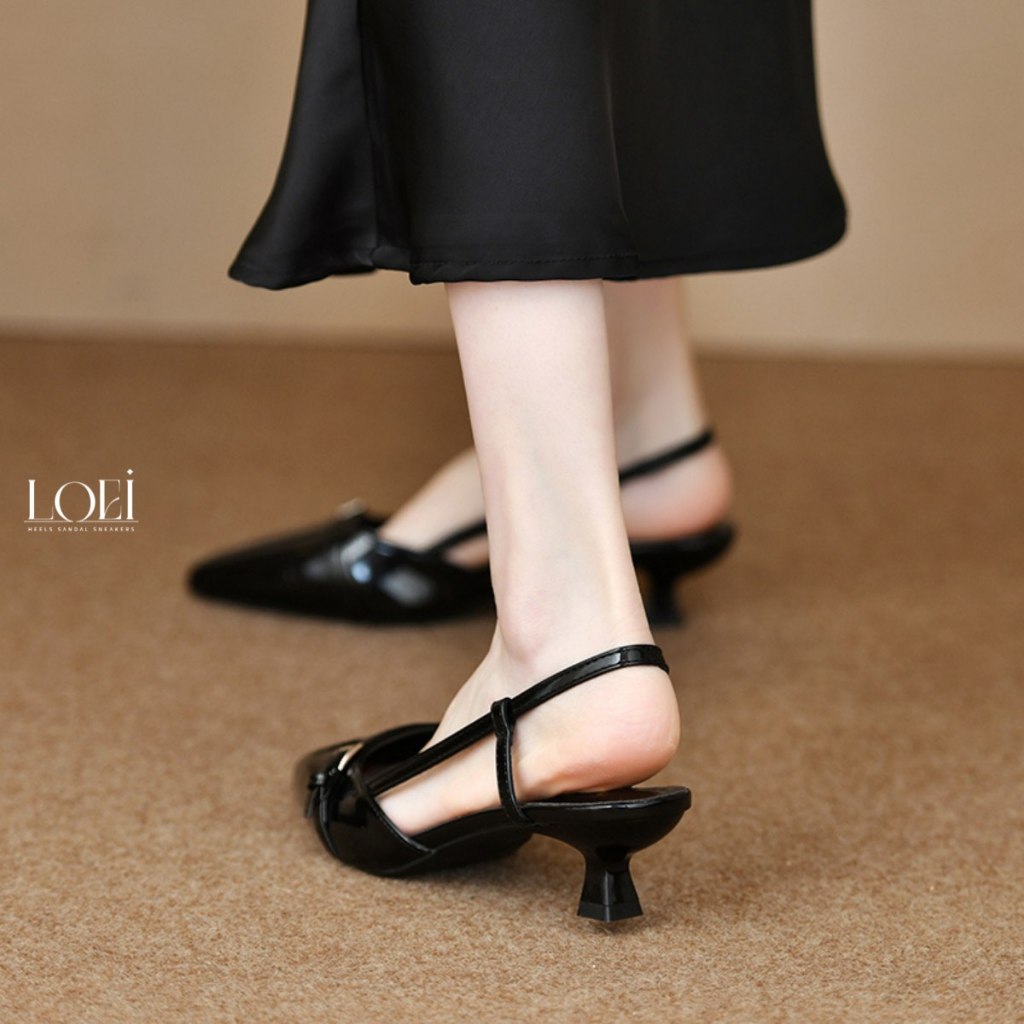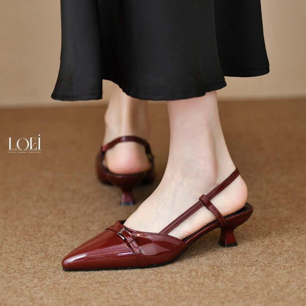 LOEI Shiny Sepatu Lancip Elegant Heels Slingback Pointy Terbaru Glossy Mewah A08