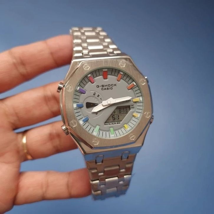 JAM TANGAN PRIA CASIO G-SHOCK GM-2100 SILVER GREY RAINBOW STAINLESS STEEL FREE ONGKIR - FREE BOX