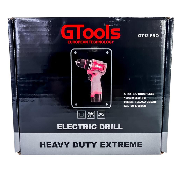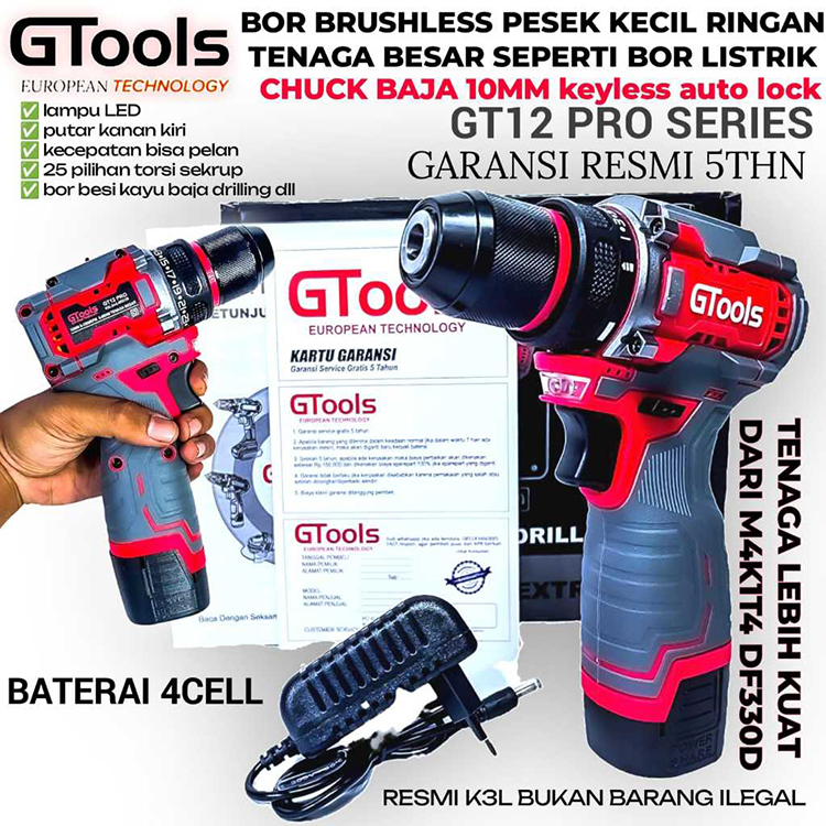 GTOOLS TYPE GT12 PRO Bor Cordless Brushless 10mm Keyless Auto Lock Mesin Bor Besi Kayu Driver Sekrup Drill
