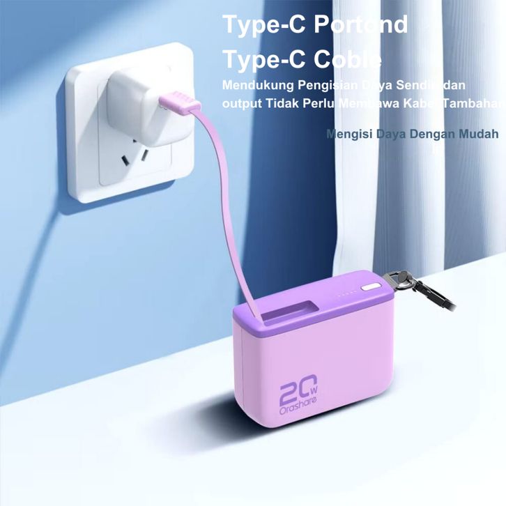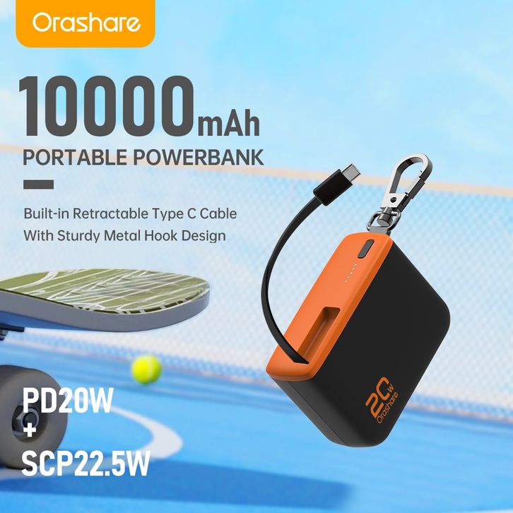 Power Bank Fast Charging Orashare PR10 Powerbank 10000mAh With Built in Retractable Type C Cable PD20W Fast Charge